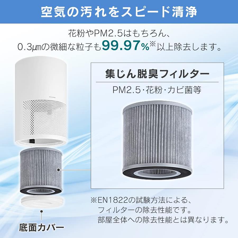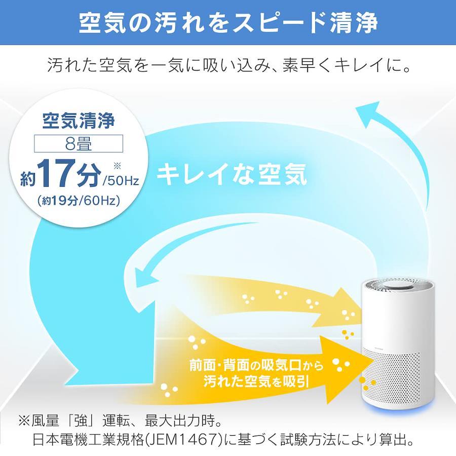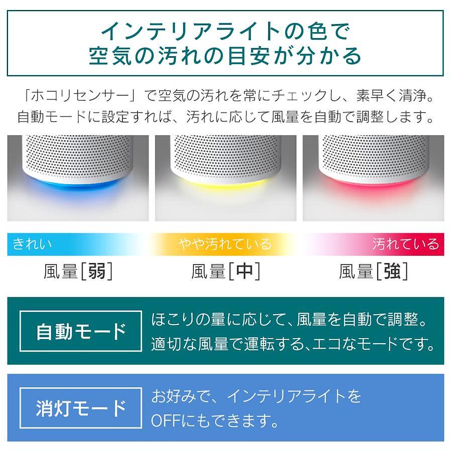 3営業日以内に発送≪新品未開封品≫:コンパクトでシンプルな空気清浄機です。お部屋の空気の状態に合わせて、風量調整可能。自動モードでは、ほこりセンサーで計測した空気の汚れ具合によってインテリアライトの色が切り替わり、風量も切り替わります。ロック(長押し)ボタンを3秒押すと、チャイルドロックがかかります。便利な切りタイマー(1h、2h、4h、8h)付き。シンプルな操作パネルで、誰でも簡単に操作できます。