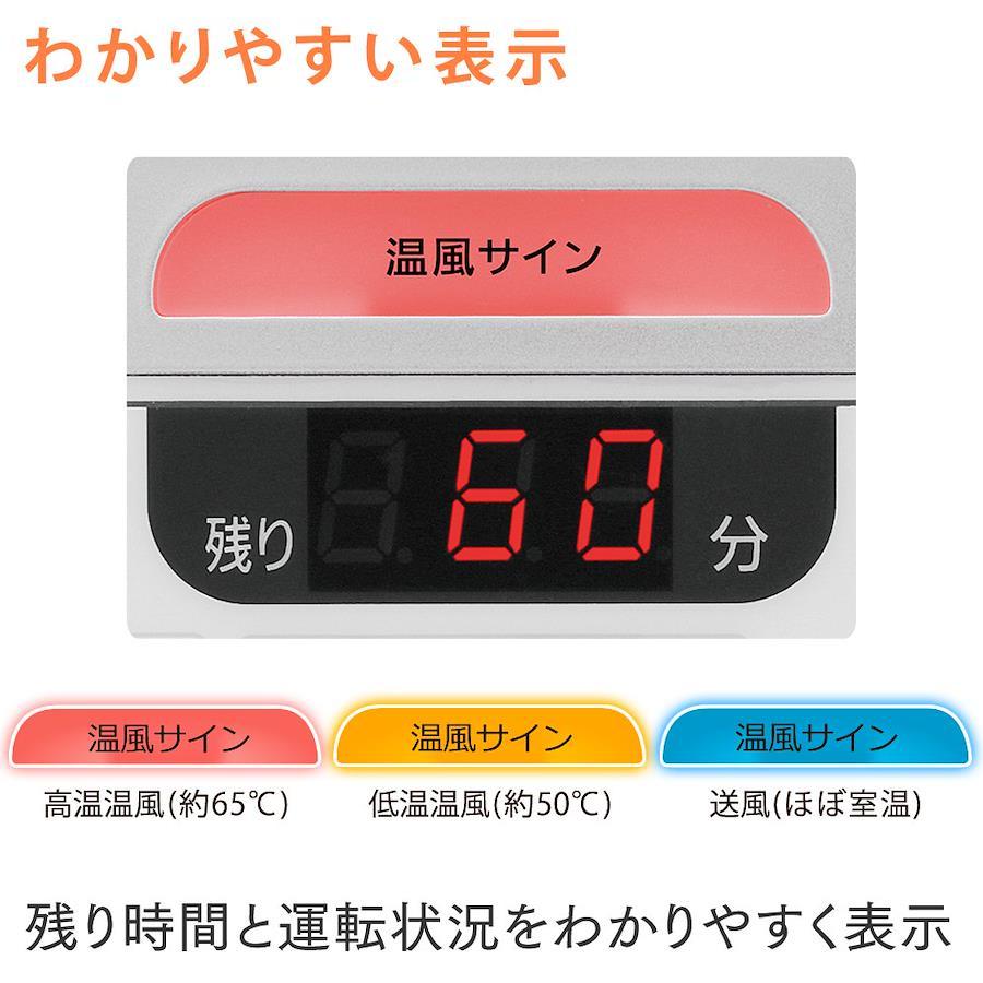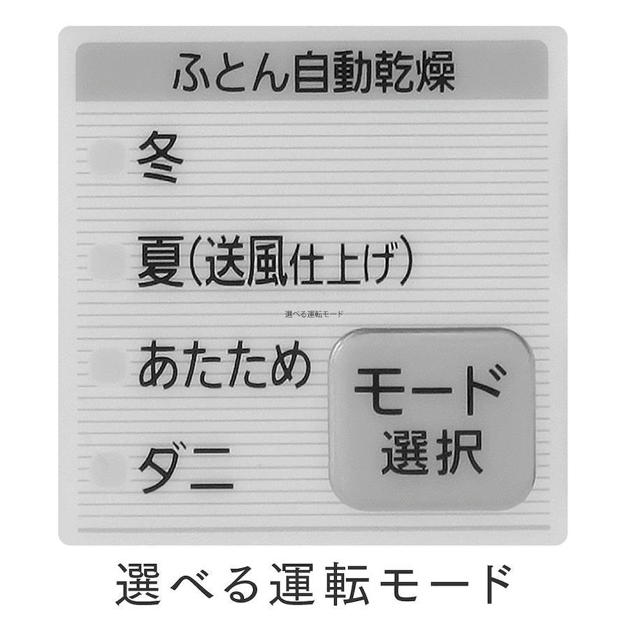 ●選べる4モード搭載で多様な用途に使用可能。季節や用途に合わせた4つのモードを搭載。モード選択ボタン一つで操作できます。さらに「温風サイン」を搭載し、排出する熱風の温度が色で分かるため、運転状況がひと目で把握できます。 ・冬モード(60分):布団の内部まで温め、冷えた布団をふっくらと仕上げます。・夏モード(送風仕上げ、80分):布団を乾燥させた後に20分の送風運転を行います。布団にこもった汗などの湿気を取り除きます。 ・あたためモード(20分):冬の寒い時期、就寝前の布団の加温に最適です。・ダニモード(100