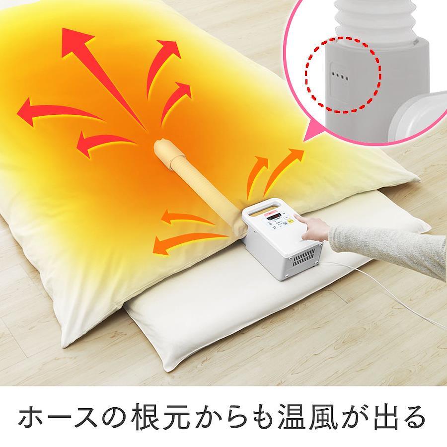 ●ホースを差し込むだけで布団全体をまんべんなく乾燥。布団乾燥用のマットを使用せず、約50cmのホースを差し込むだけで布団の乾燥ができます。布団内部に広がる十分な風量と温度コントロールにより、布団全体をしっかり温めます