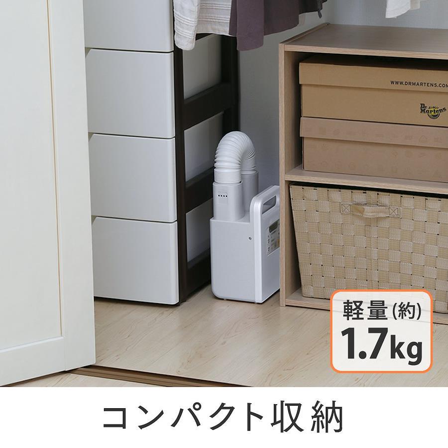●クラス最小最軽量(※1)の1.7kg女性や高齢者も持ち運びやすい1.7kgの軽量設計です。さらに、本体はB4用紙に収まるコンパクトサイズで収納場所にも困りません。 ※1:国内におけるマット不使用タイプ布団乾燥機(消費電力400W以上)において(2015年2月現在)