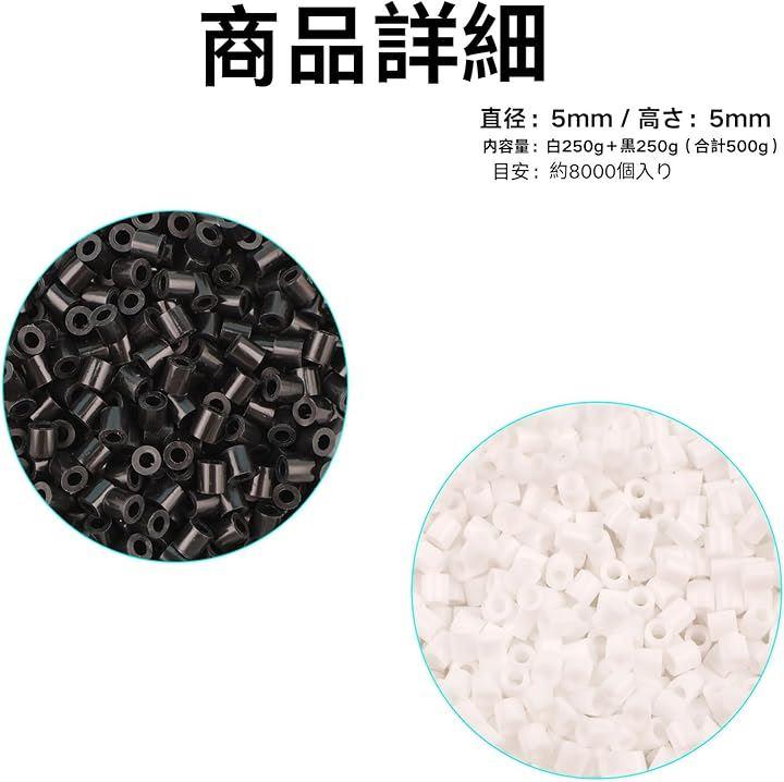 製品仕様 直径:5mm/高さ:5mm 内容量:白250g+黒250g(合計500g) 目安:約8000個入り 袋入りで保管もしやすく、必要な分だけ取り出せます。