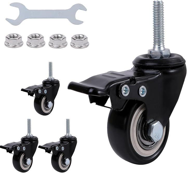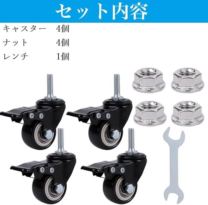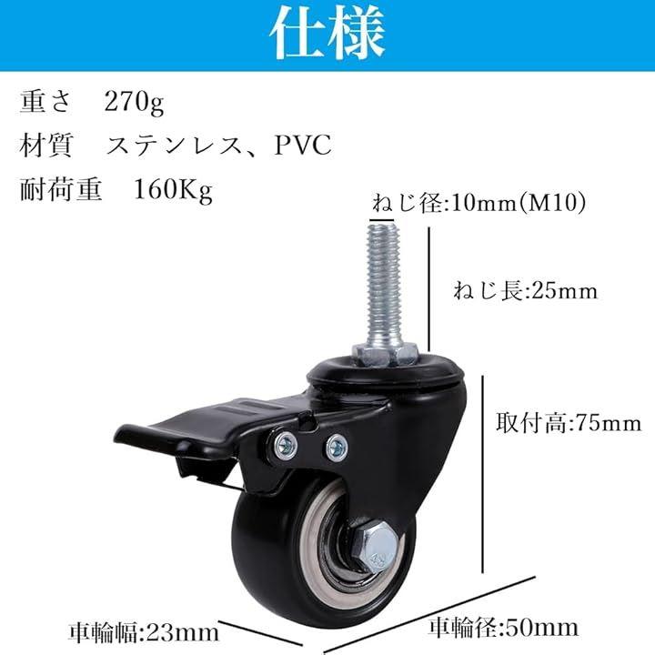 「サイズ」車輪径:50mm 車輪幅:23mm 取付高:75mm ねじ径:10mm(M10) ねじ長:25mm 「許容荷重」160kg 「セット内容」キャスター 4個 、ナット4個、レンチ1個