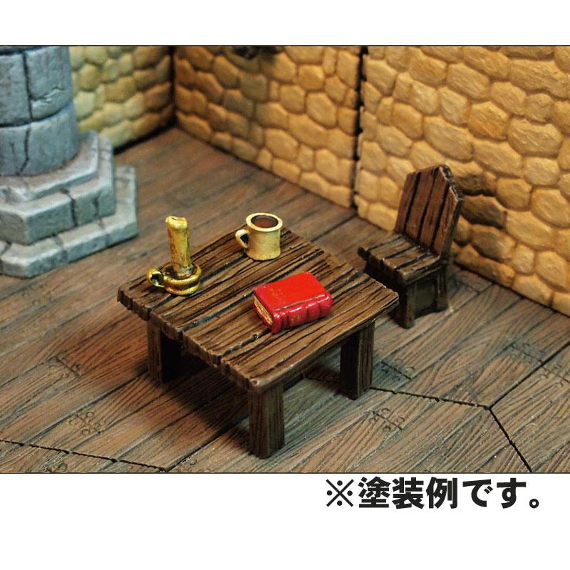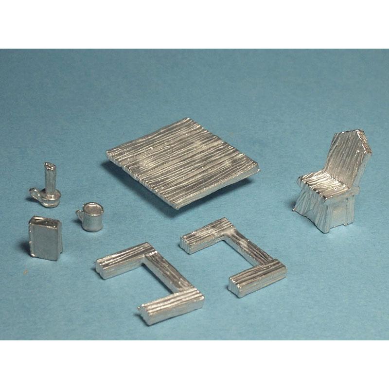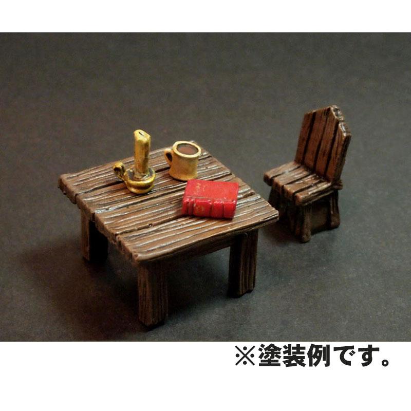 KT-020 Accessory Set F <アクセサリーセットF 〜デスクセット〜>机, 椅子, 燭台, 本, カップのセットです。1/48スケール・ホワイトメタル製・7パーツデスクサイズ: 28mm x 24mm x 14mm