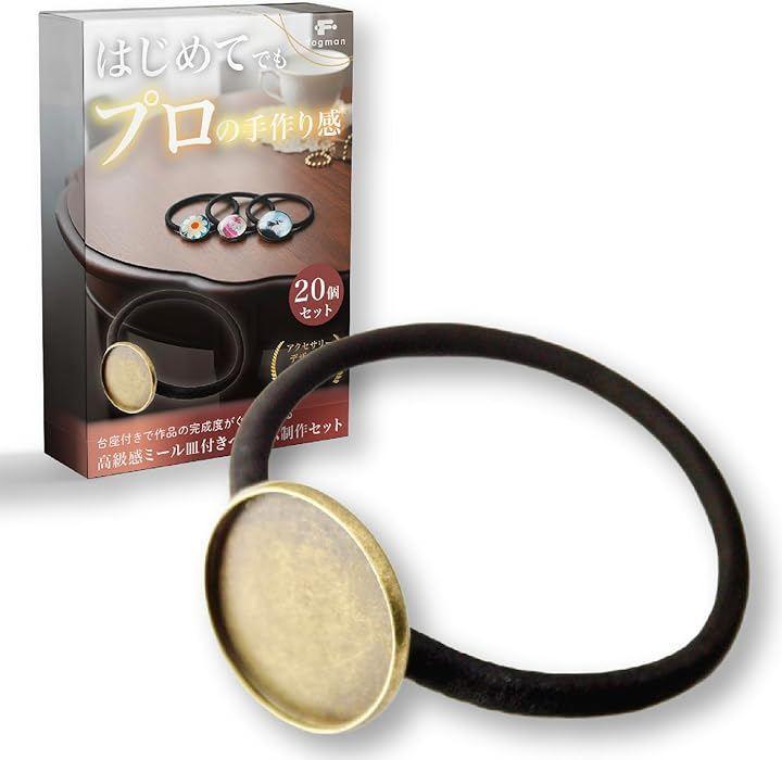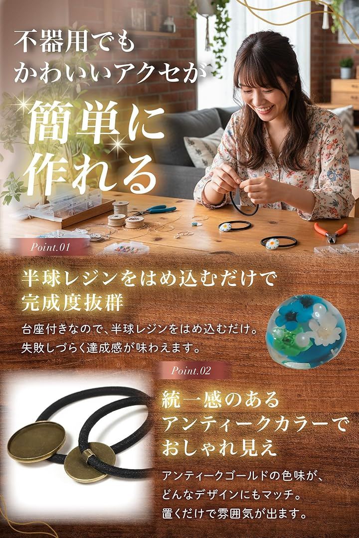 「商品仕様」 ヘアゴム20点(ブラック)+台座パーツ20点(アンティークゴールド)/サイズ:約20mm/材質:銅/対応:レジン・カボション・ガラスドーム