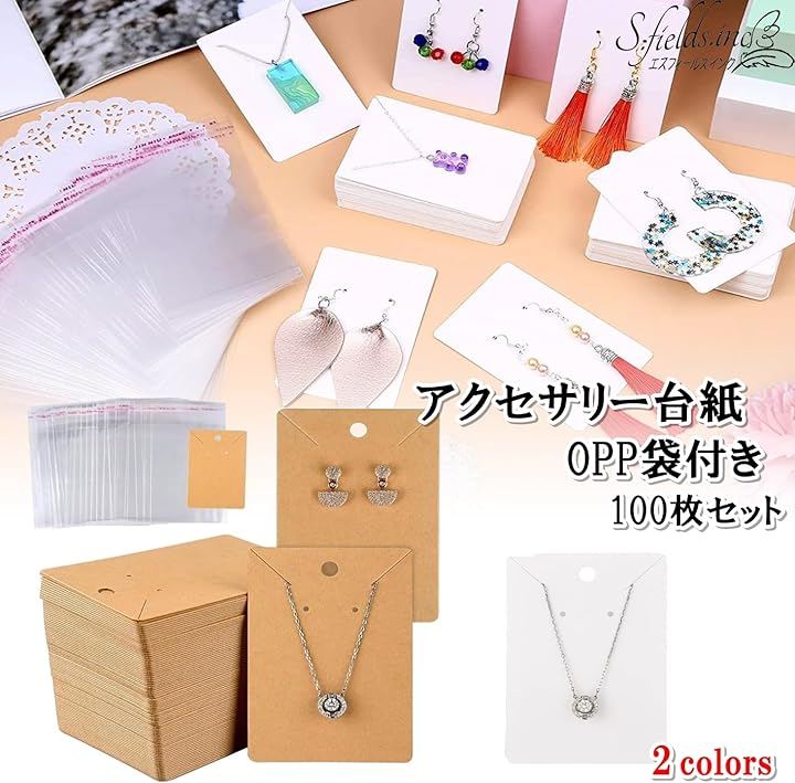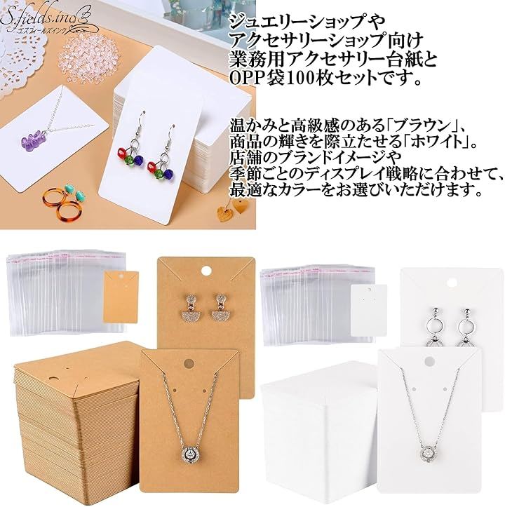 商品の魅力を最大限に引き出し、お客様に上質な印象を与える、ジュエリーショップやアクセサリーショップ向け業務用アクセサリー台紙とOPP袋100枚セットです。
