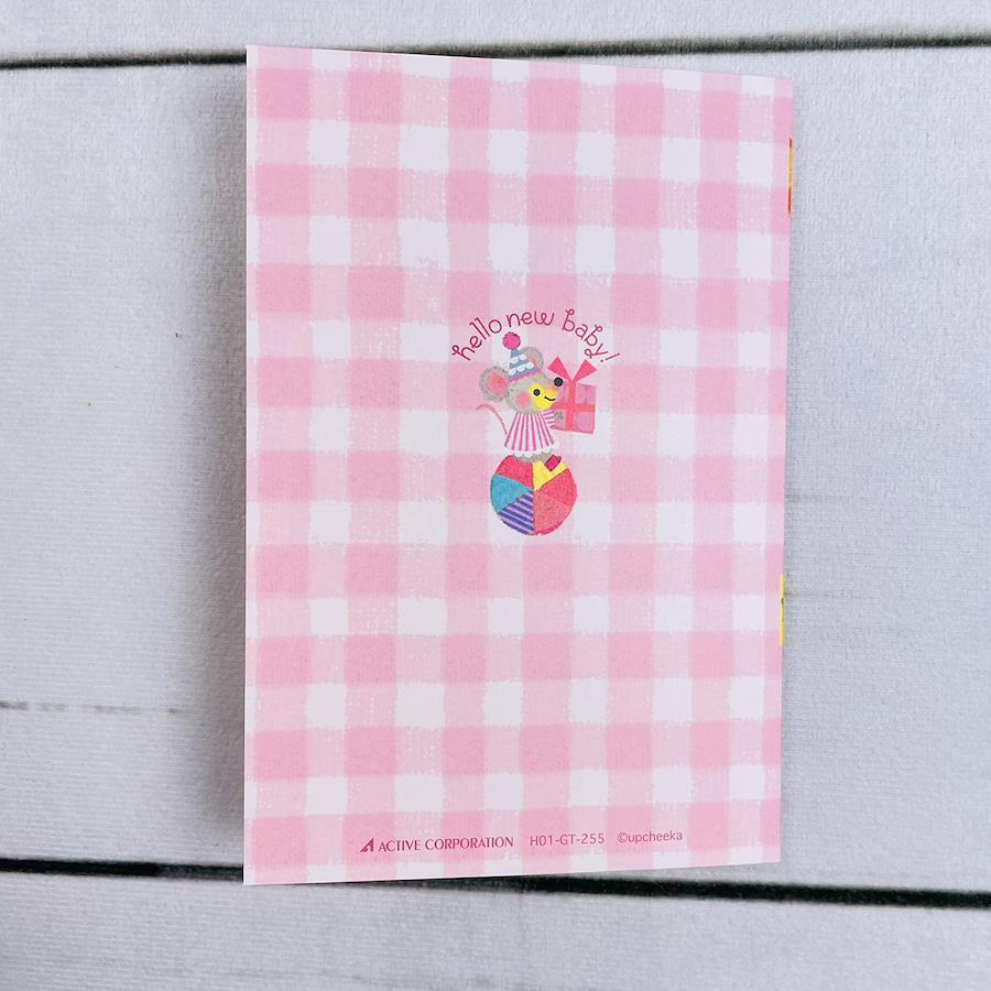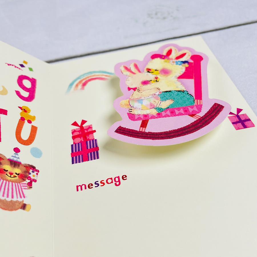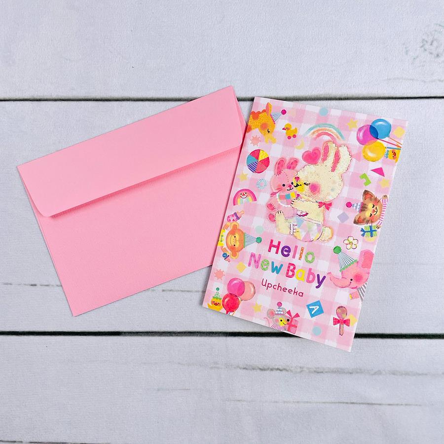 Upcheekaの出産祝いメッセージカードです。ゆらゆら揺れるウサギがとってもチャーミングで、受け取った方もにっこり笑顔になれる楽しいカードです。かわいい封筒も付いています。