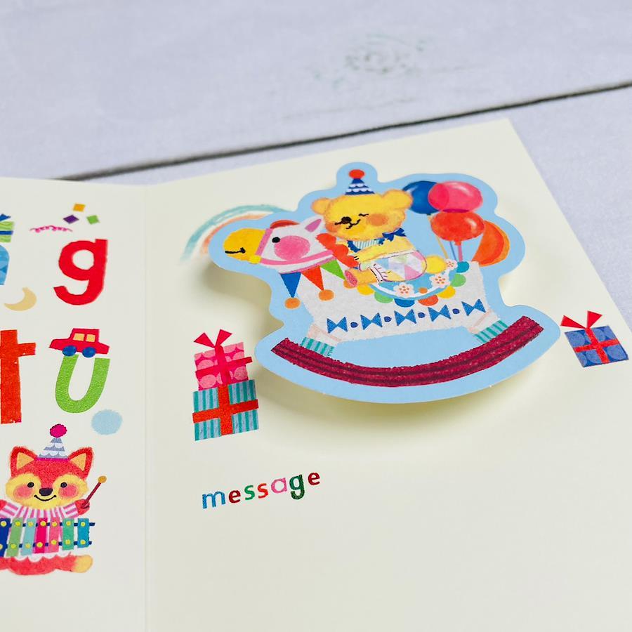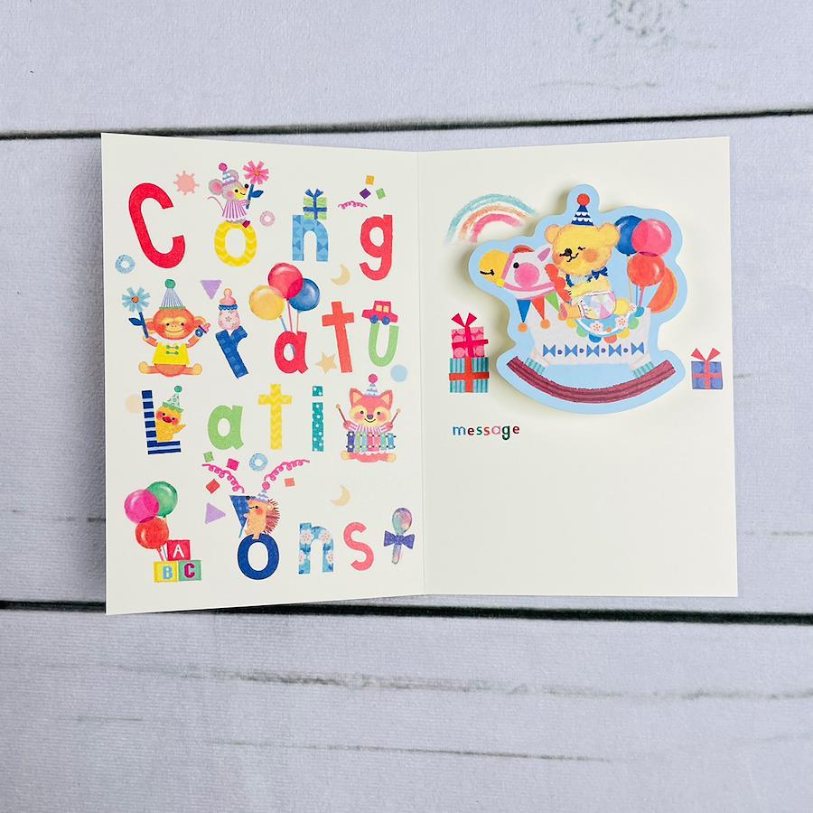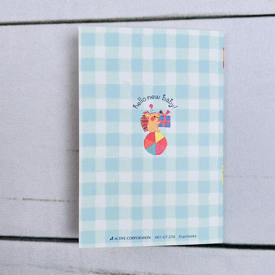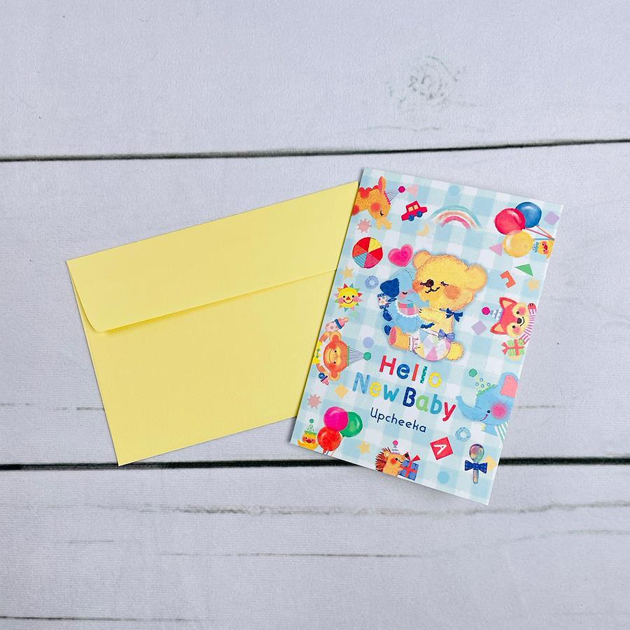 Upcheekaの出産祝いメッセージカードです。ゆらゆら揺れるクマがとってもチャーミングで、受け取った方もにっこり笑顔になれる楽しいカードです。かわいい封筒も付いています。