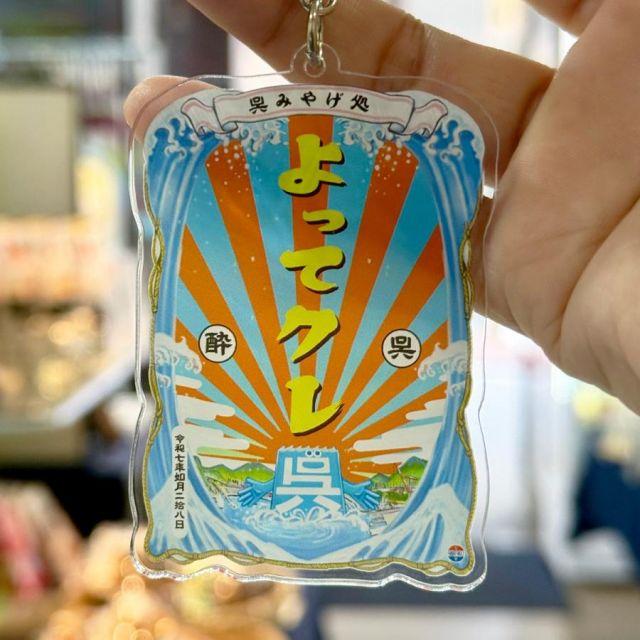 商品名:アクリルキーホルダー「よってクレ」 キャラクター 呉市 クレシ KURESHI 土産 プレゼント ギフト ふるさと ゆるキャラ ご当地 キャラ 広島 安楽雅志「大和ミュージアム サテライト館」に合わせて期間限定でオープンしている、呉のお土産処「よってクレ」のオリジナルグッズ。店の看板にも使われているイラストをにアクリルキーホルダーにしました。呉出身のイラストレーター・安楽雅志 氏によるデザインで、「九嶺」と「呉の街」と海から生まれた呉市のPRキャラクター「呉氏」が描かれています。昭和を感じさせる懐かしいデザインで、呉を訪れた多くの観光客を魅了し続けています♪いつでも「よってクレ」と「呉氏」を身近に感じられる、呉らしさ溢れるアイテムです!サイズ:縦約7.8cm×横約5.1cm素材:アクリル