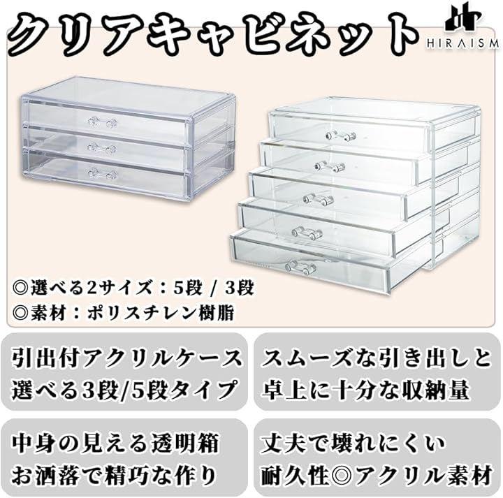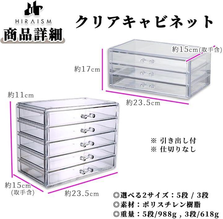 「商品内容」クリアキャビネット:3段 カラー:透明 サイズ:幅:23.5cm 高さ:11cm 奥行:15cm(取手含む) 重量:618g 素材:PS(ポリスチレン樹脂) 備考:引き出し付き、仕切りなし