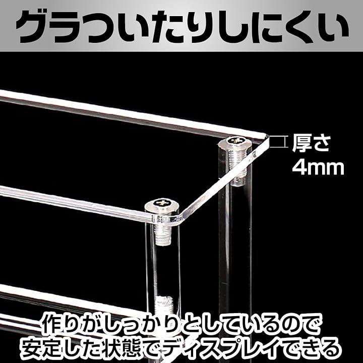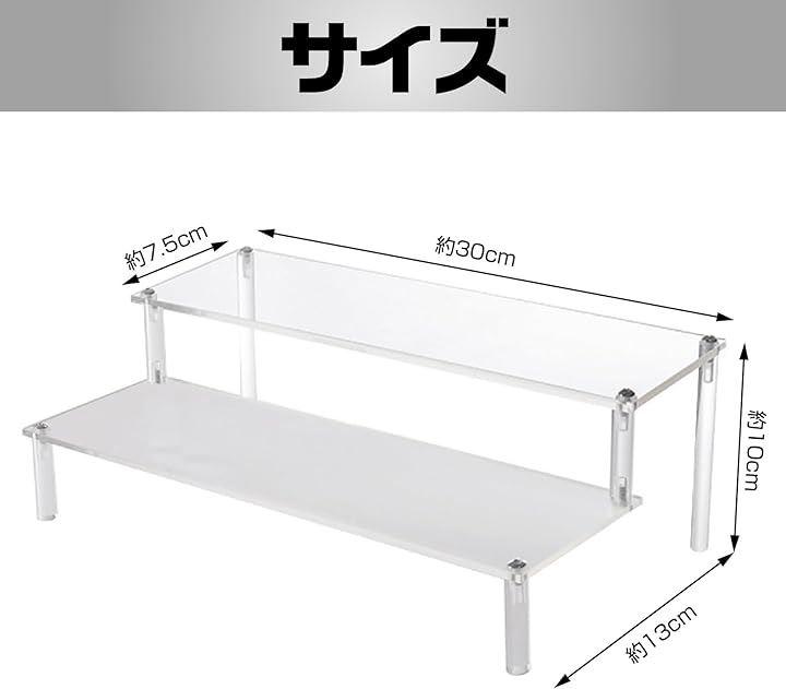 フィギュアケース2段2個、幅30x奥行き13x高さ10cm、台の奥行7.5cm、アクリル製、クリア、金属ねじビス。