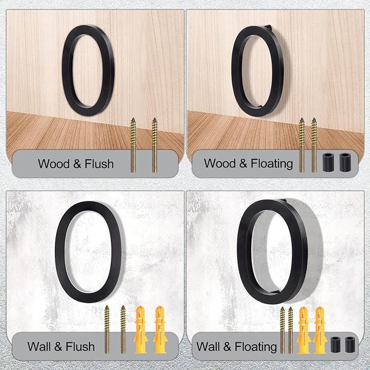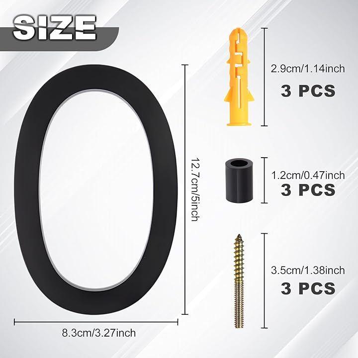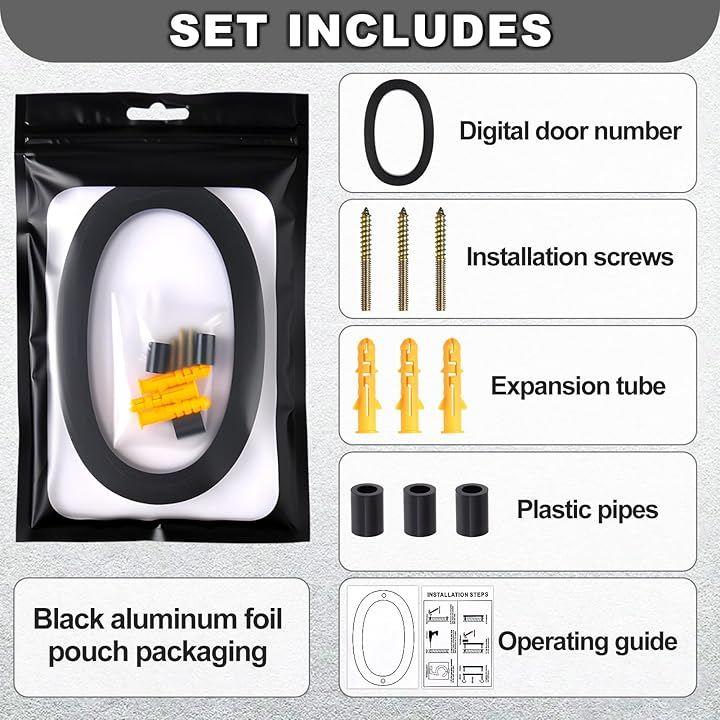 「取り付けキット付属」アクリル製家番号プレート1枚、ネジ3本、壁プラグ3個、プラスチックスペーサー3個、ステップバイステップの取り付けガイドが同梱されています。