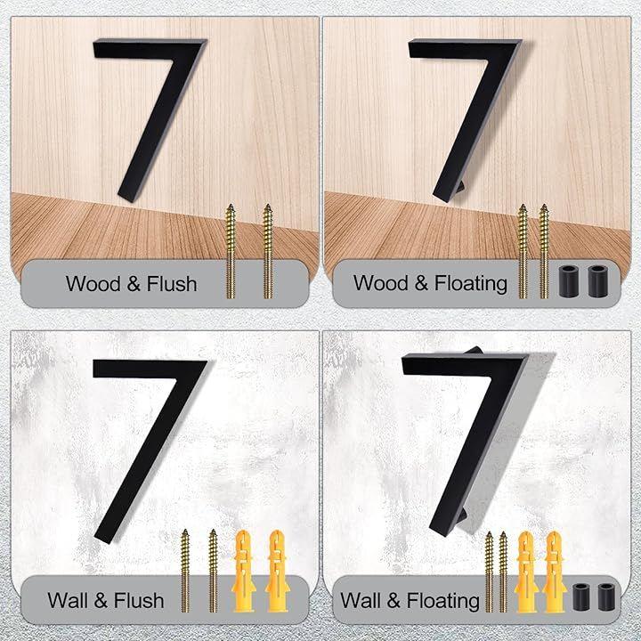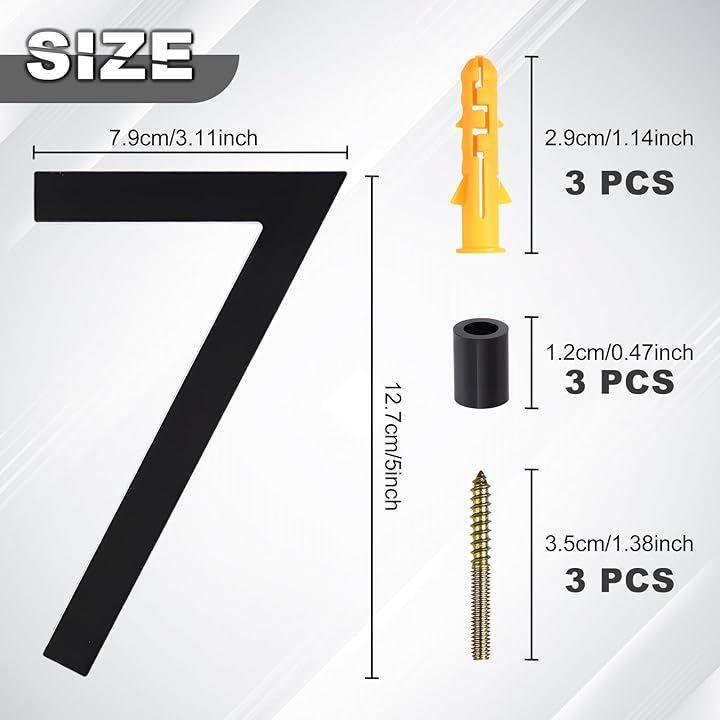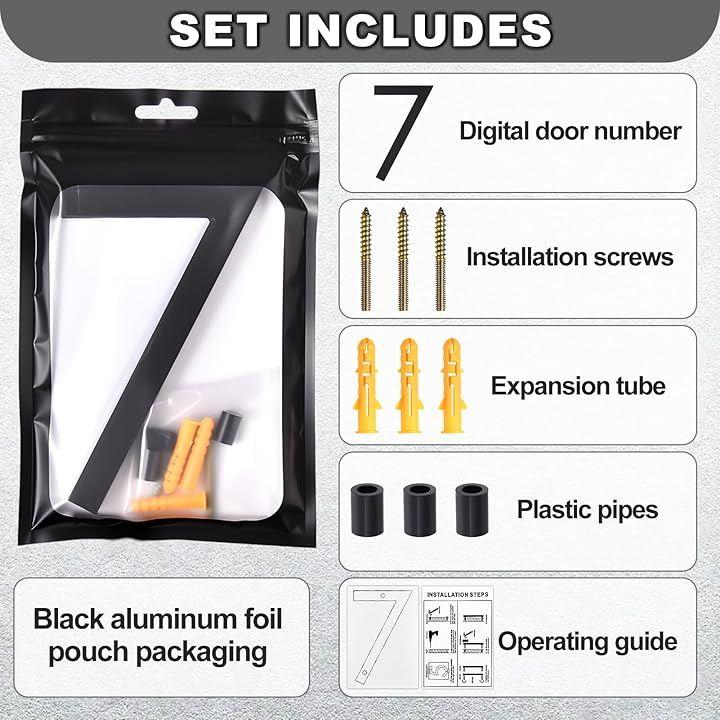 「取り付けキット付属」アクリル製家番号プレート1枚、ネジ3本、壁プラグ3個、プラスチックスペーサー3個、ステップバイステップの取り付けガイドが同梱されています。