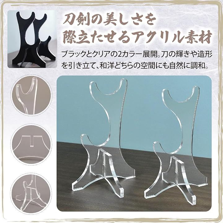 透明アクリルを採用しており、刀剣本来の輝きや造形美をそのまま引き立てます。