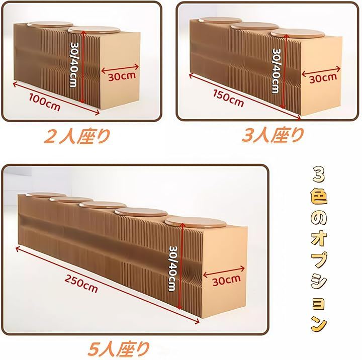「商品仕様」商品は3色(ダークブラウン,ブラウン,ホワイト)、3種類の横長(長100cm2人座り,150cm3人座り,250cm5人座り)、2種類の高さ(30cmと40cm)があります。