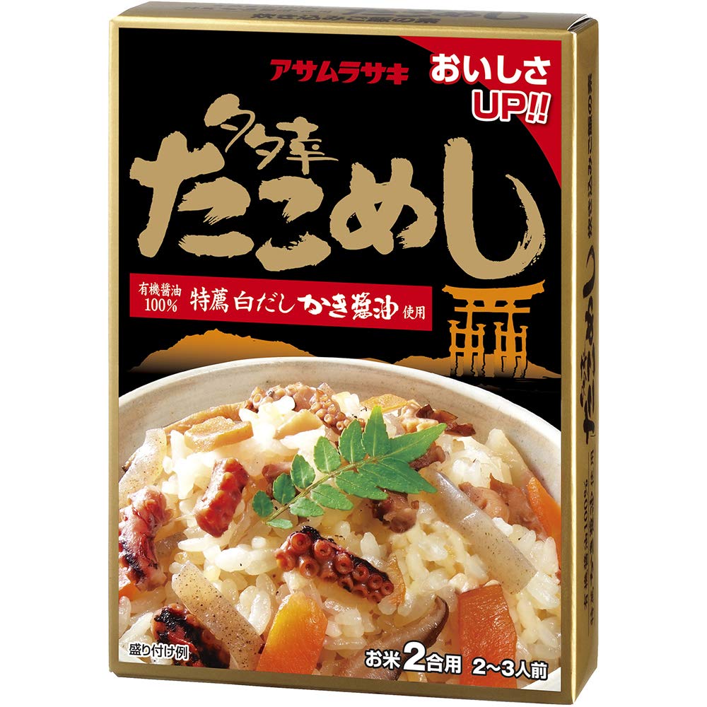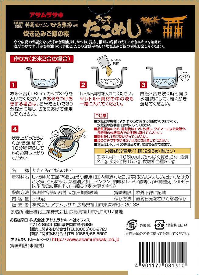 有機醤油100%使用。広島県産かき醤油の旨みとたこの食感が美味です。にんじん、しいたけ、たけのこ,こんにゃくを加えております。うす味でありながらしっかりとした旨みをお楽しみいただけます。炊き込みご飯のほか、おにぎりにしても美味です。お米2合用2~3人前です。1箱(295g)当り エネルギー 106kcal たんぱく質 6.2g 脂質 2.1g 炭水化物 15.3g 食塩相当量 8.0g