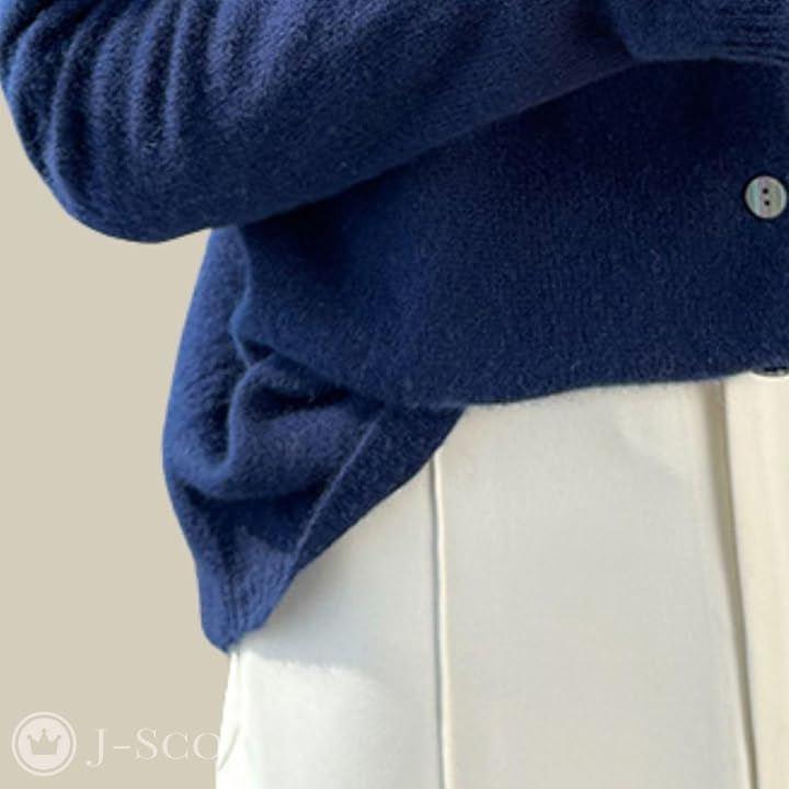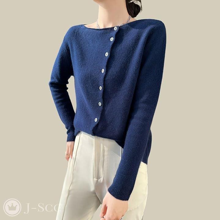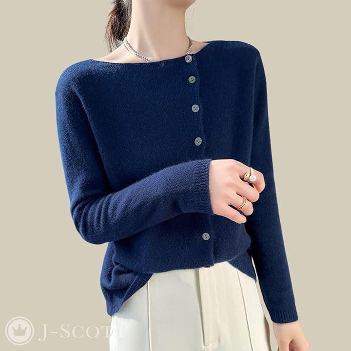「上品さを引き立てるアシンメトリーカーディガン」 斜めに配したボタンラインがさりげない個性を演出し、シンプルながら洗練された印象を与えるカーディガン。