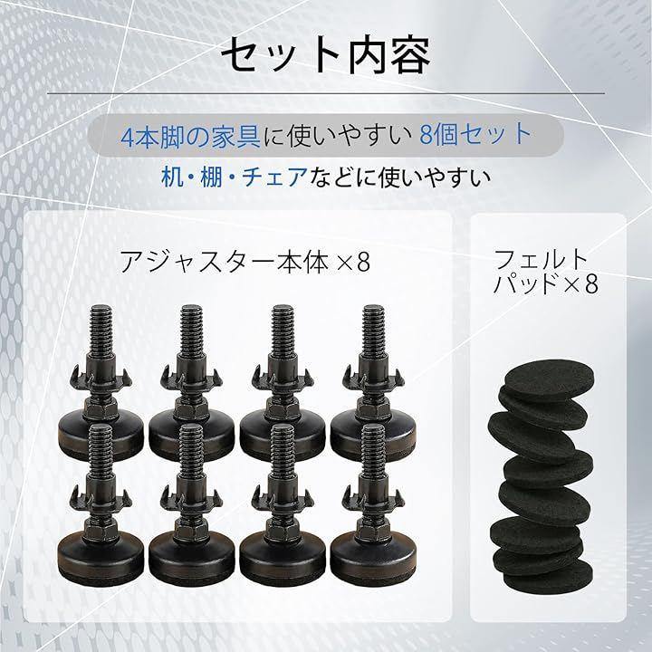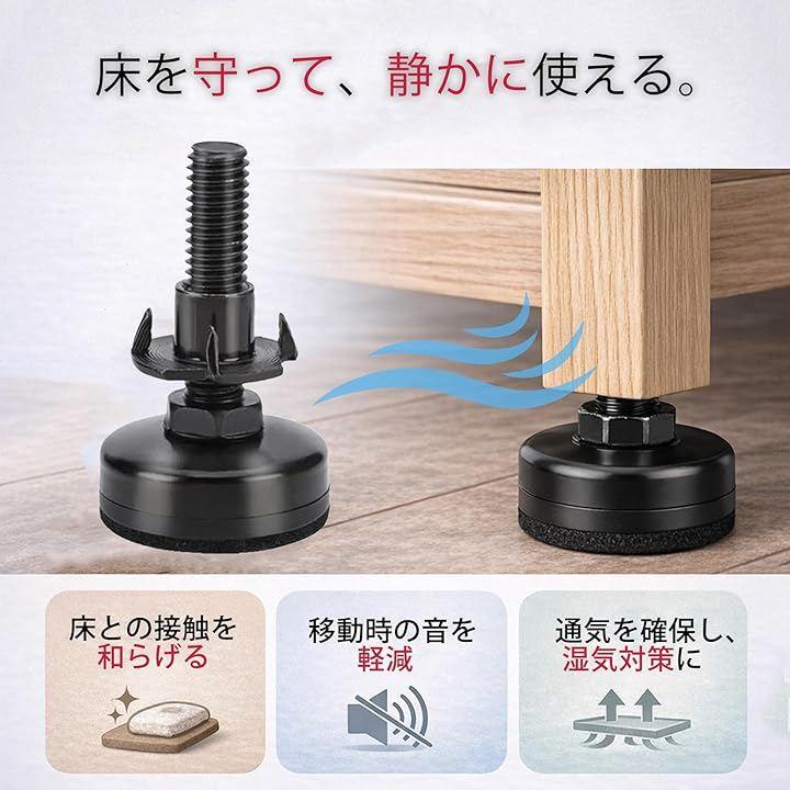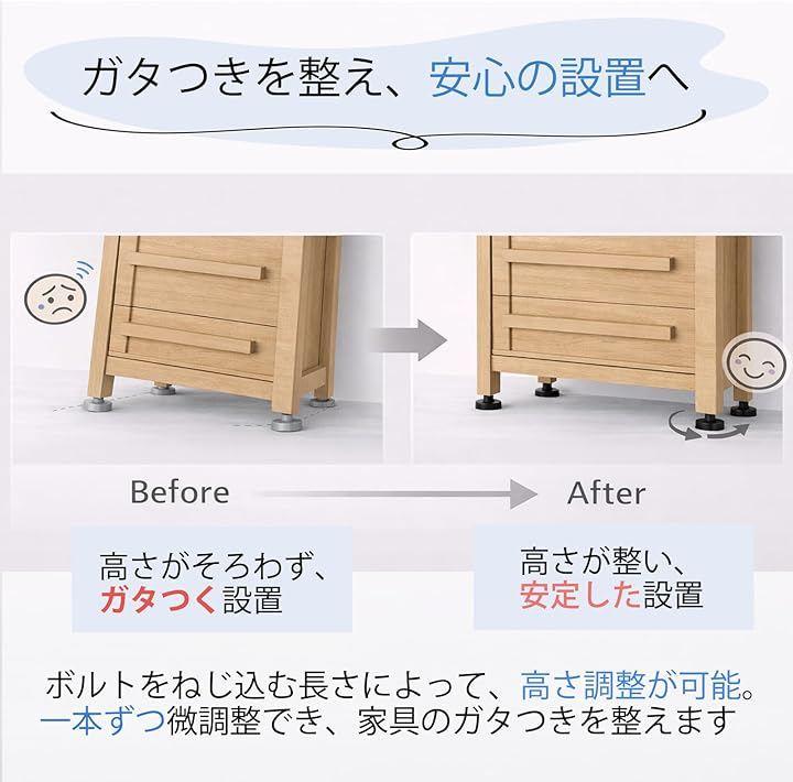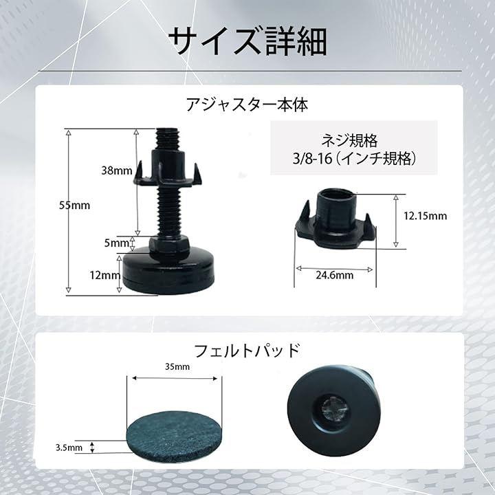 高さ調整可能:ボルトをねじ込む長さによって2cm程度高さの調整が可能、一本ずつ高さを微調整できるからちょっとした水平調整にも便利なアジャスターです。