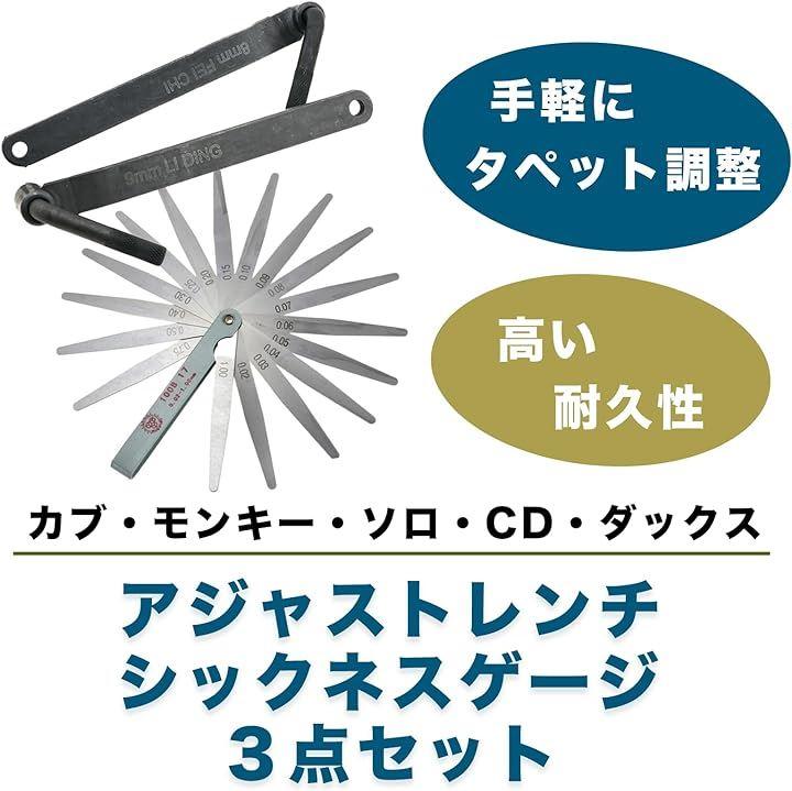 アジャストレンチとシックネスゲージ3点セット。バイク 横型エンジン (カブ・モンキー・ソロ・CD・ダックス)のタペット調整を効率化させる為のアジャストレンチ・バルブクリアランス調整レンチ、正確に調整する為のシックネスゲージのセットになります。