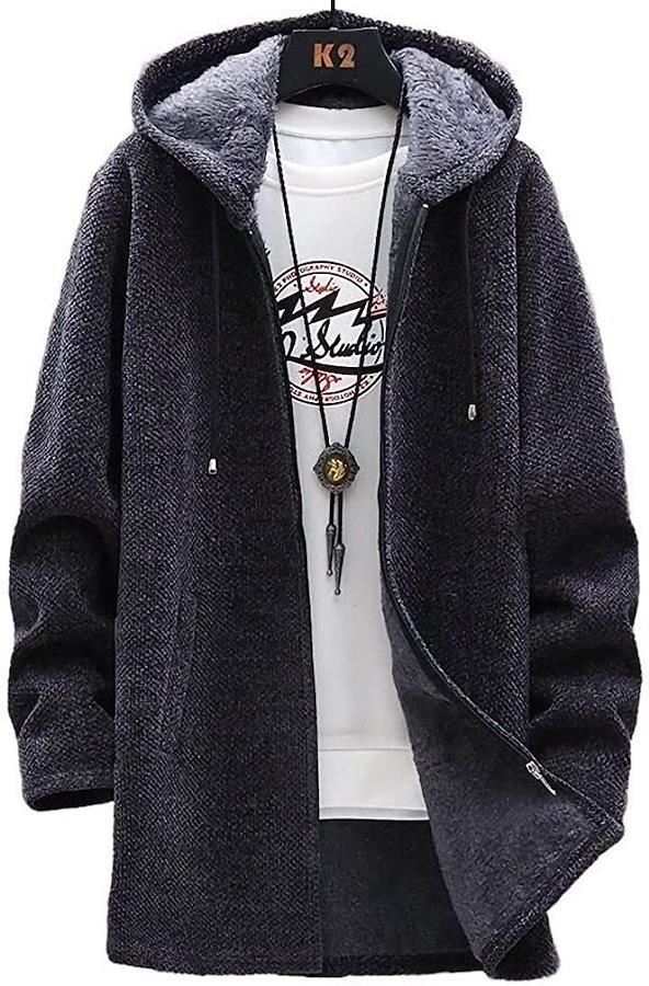 Aspersio Men's Hooded Zip-Up Long Coat in a Bitter Colorway. Stylish Fleece-Lined Cardigan with Long Sleeves. Also suitable as a zip-up hoodie or jacket. Perfect for streetwear. Warm and stylish.