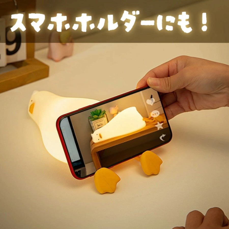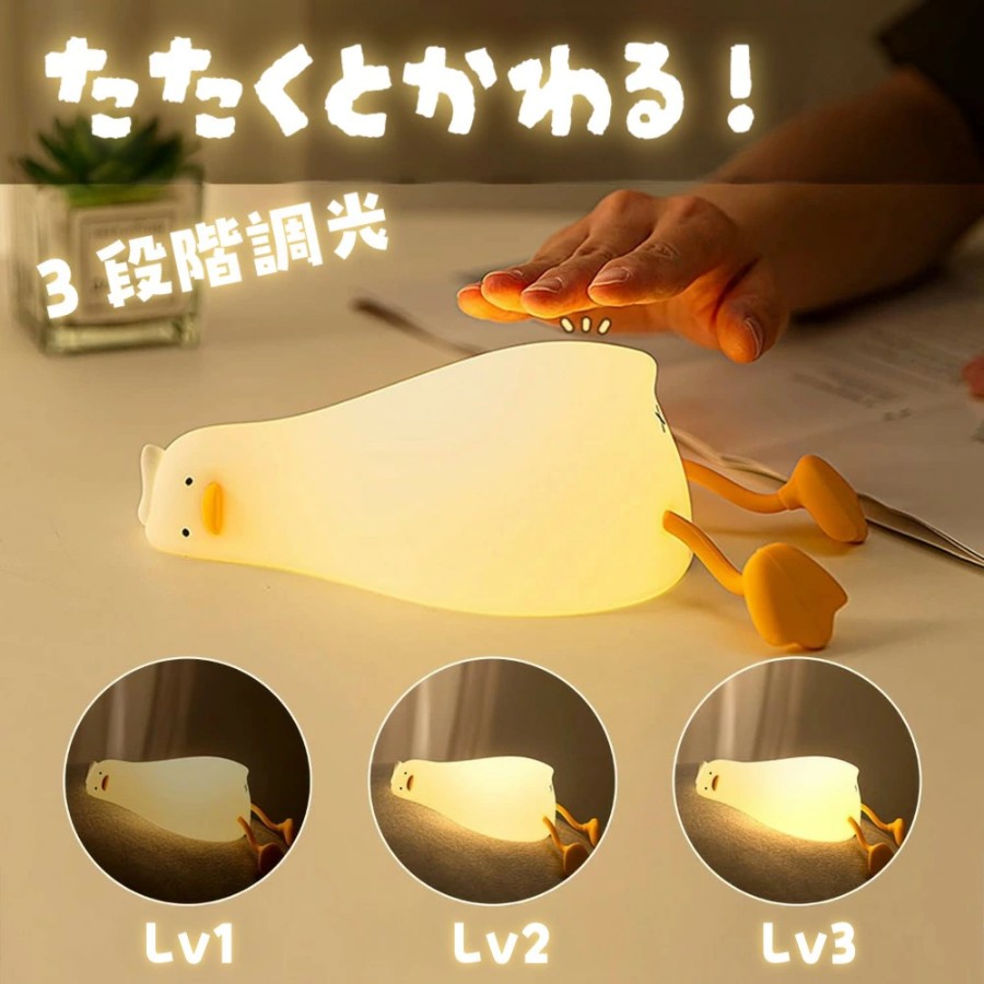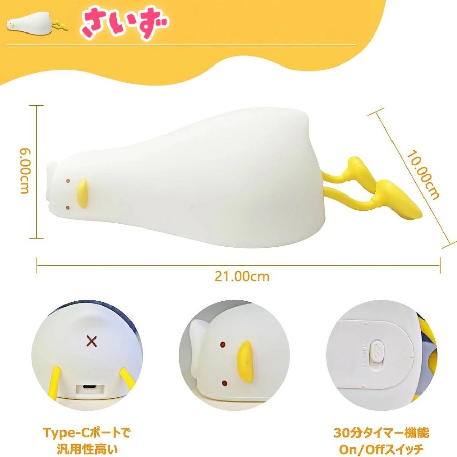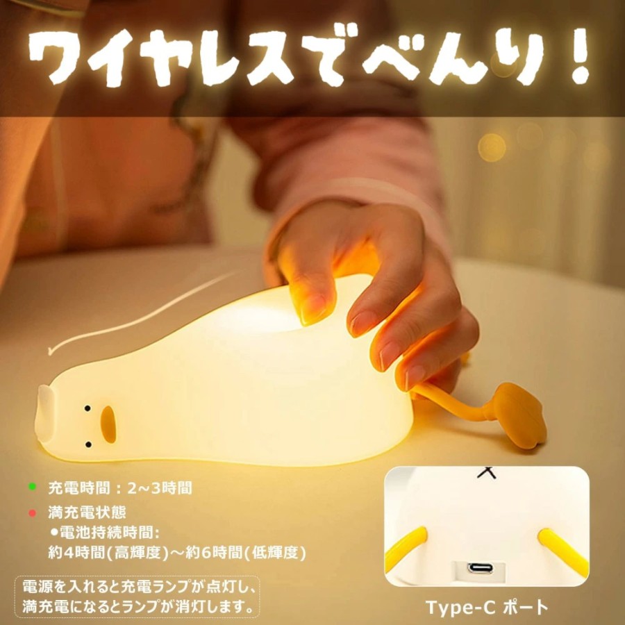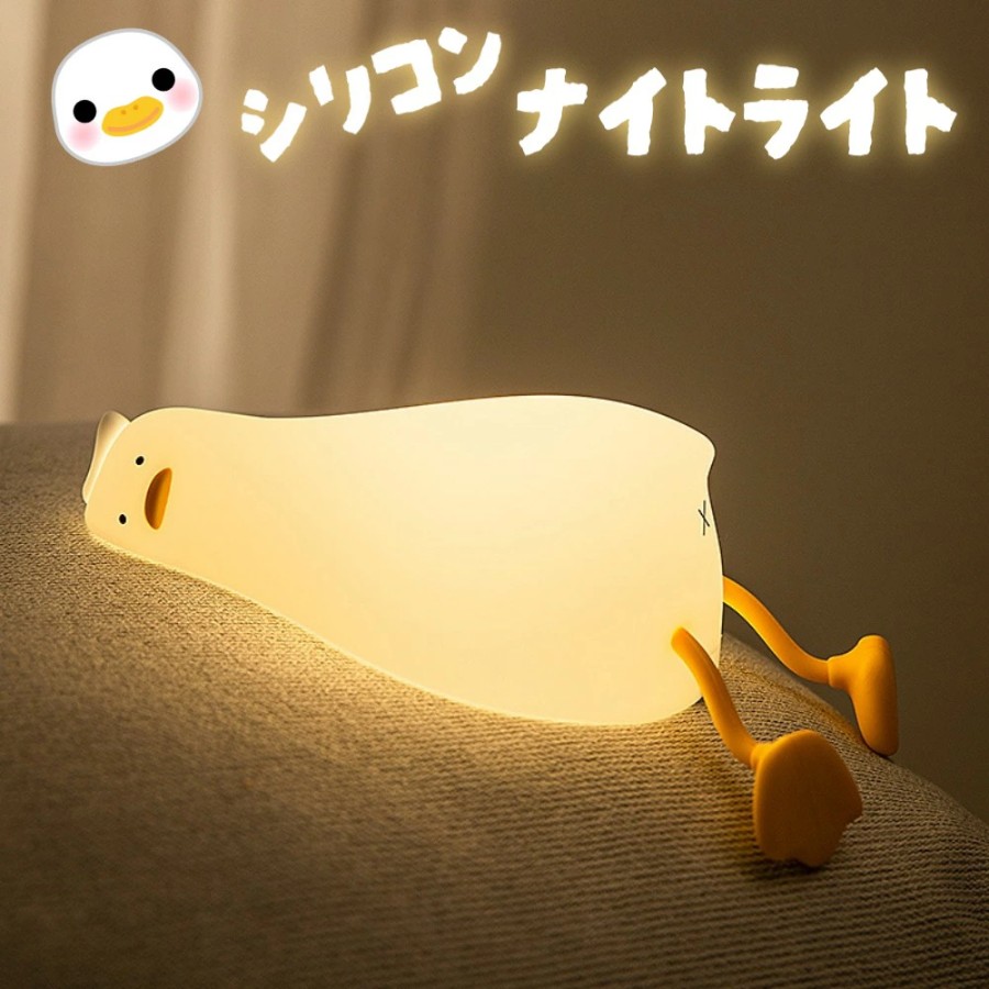 ぽてっと寝転んだアヒルの姿がかわいい、やわらかシリコン製の充電式LEDナイトライトです。