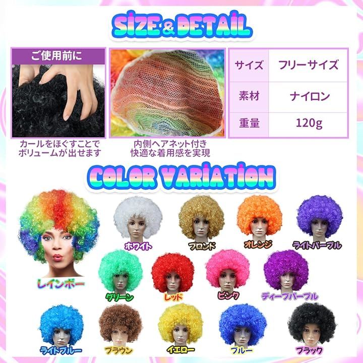 「映える。カラフル アフロ ウィッグ 全14色」かぶるだけであなたが主役。軽量でボリューム感抜群のアフロヘアーのウィッグです。カラーバリエが豊富だから様々なシーンで大活躍。
