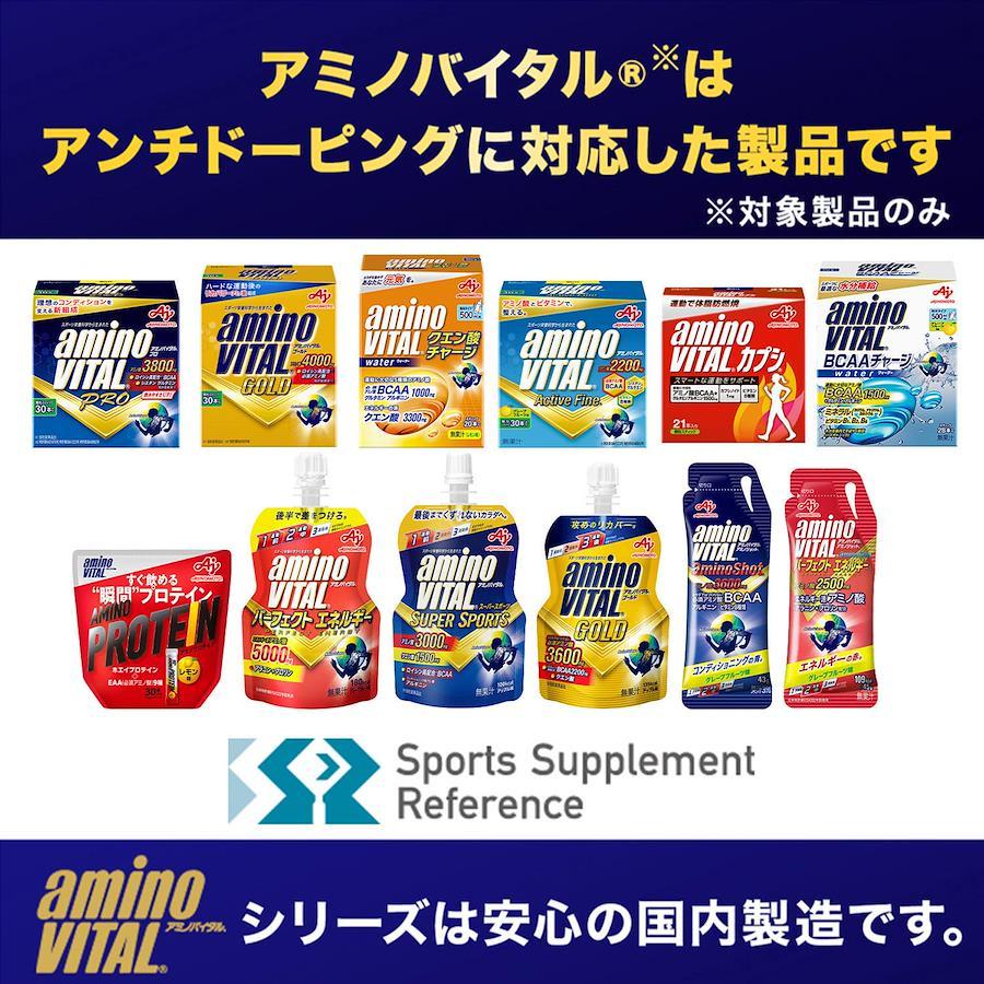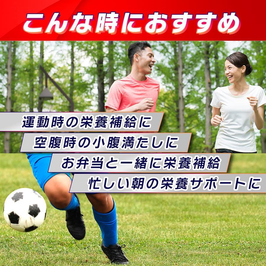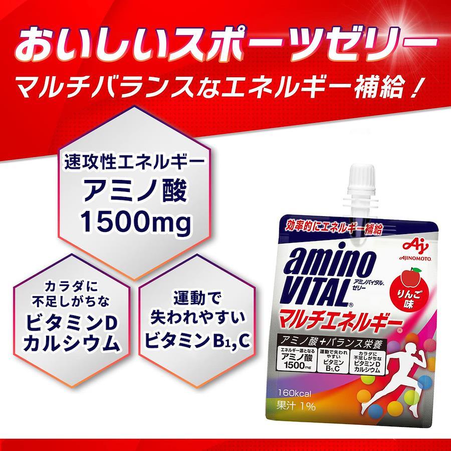 エネルギー源となるアミノ酸1500mg、運動で失われやすいビタミンB1、ビタミンC、カラダに不足しがちなビタミンD、カルシウム、ご飯1杯分相当のエネルギー160kcalを配合した、効率的でバランスの良い栄養補給をサポートするゼリードリンクです。スポーツ時にもおいしくお飲み頂けるすっきりとしたりんご味です。 運動時や、日々の生活でカラダに不足しがちな栄養素が入った、効率的でバランスの良い栄養補給をサポートするゼリードリンクです。 運動で失われやすいビタミンB1、ビタミンC、カラダに不足しがちなビタミンD、カルシウム、ご飯1杯分相当のエネルギー160kcalを配合した、効率的でバランスの良い栄養補給をサポートするゼリードリンクです 【飲み方】スポーツ時にもおいしくお飲み頂ける、すっきりとしたりんご味です。運動前や運動中のエネルギー補給にご活用いただけます。 【利用シーン1】マラソン、サイクリング、ランニング、水泳、サッカー、野球、バレーボール、バスケ、テニス、バドミントン等、スポーツ全般でのリカバーをサポートします。 【利用シーン2】ゴルフや登山、ハイキングやウォーキング、音楽フェス等の屋外活動でのコンディショニングにもぴったりです。 【利用シーン3】ジムや自宅での運動や筋トレで筋肉を付けたい方、カラダづくりやダイエットの為に運動する方にもぴったりです。 6個セットでの販売ですので、ご自宅でのストックに便利です。 【1袋(180g)あたり】エネルギー:160kcal、アミノ酸:1500mg、カルシウム:2470mg、ビタミン:338mg
