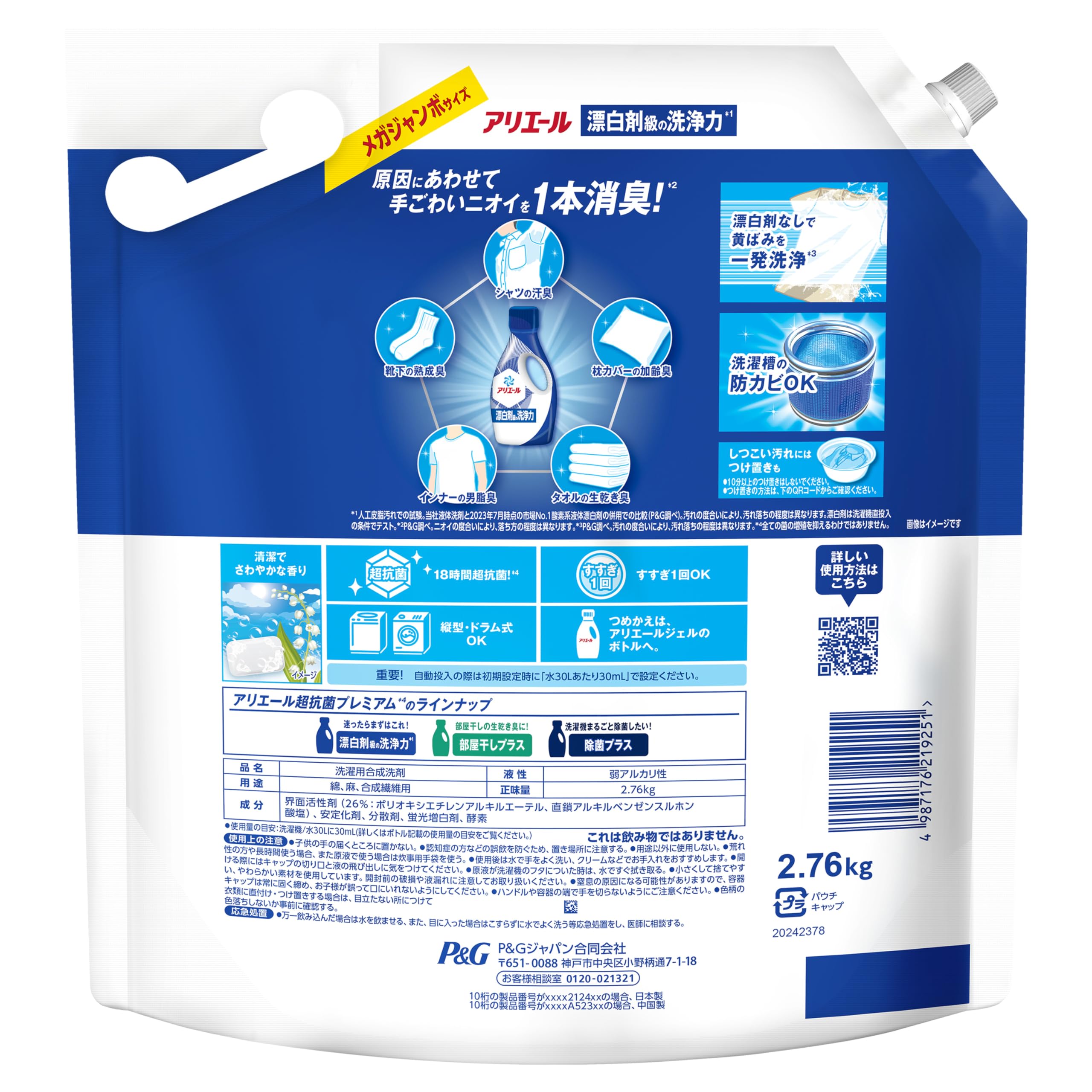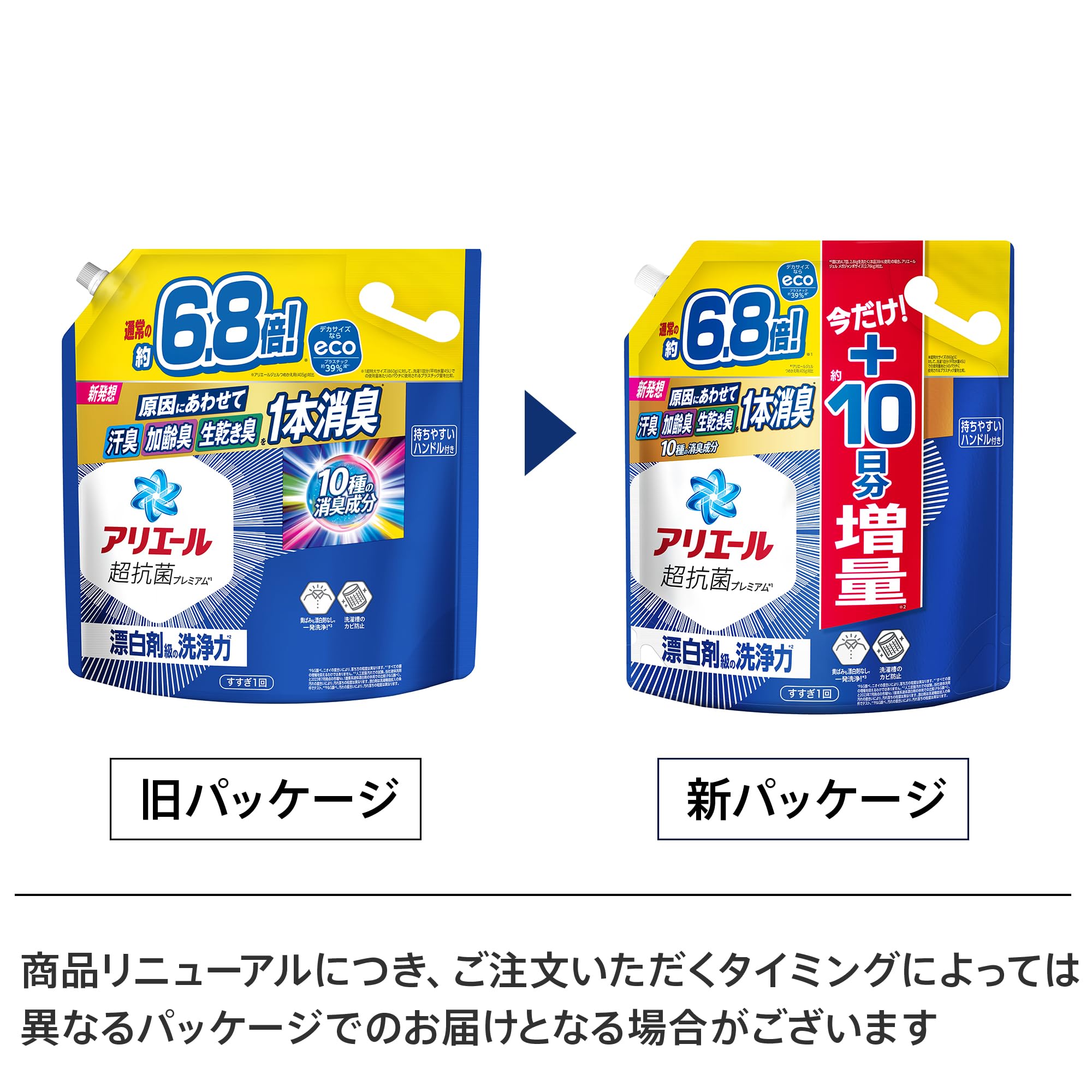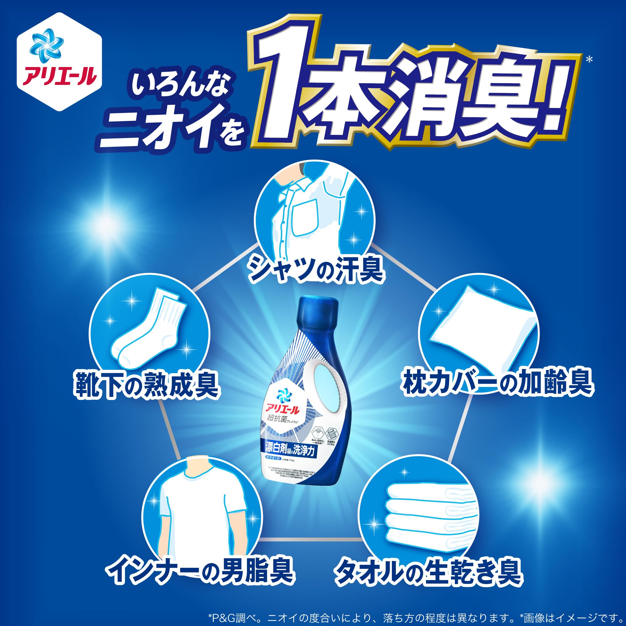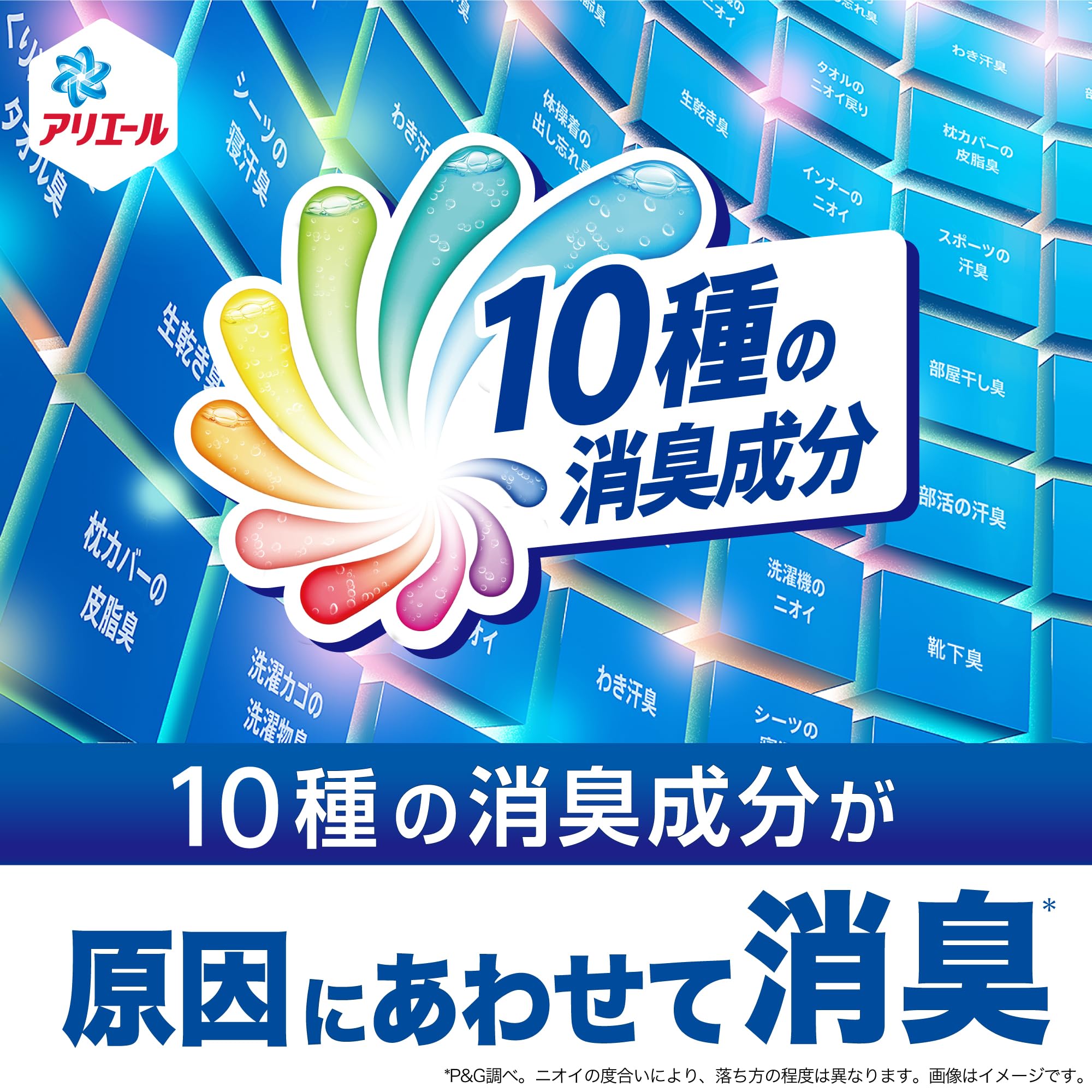 アリエール 洗濯洗剤 シャツの汗臭、タオルの生乾き臭、加齢臭 - いろんなニオイを1本消臭 *P&G調べ。ニオイの度合いにより、落ち方の程度は異なります。 10種類の消臭成分が原因にあわせてパーソナル消臭 *P&G調べ。ニオイの度合いにより、落ち方の程度は異なります。 エリソデの黄ばみも漂白剤なしで一発洗浄 *P&G調べ。汚れの度合いにより、汚れ落ちの程度は異なります。 洗濯槽クリーナーなしで洗濯槽防カビOK。18時間つづく超抗菌。 *カビは除去できません すすぎ1回OK。タテ・ドラム式対応。自動投入洗濯機にも。 洗濯洗剤