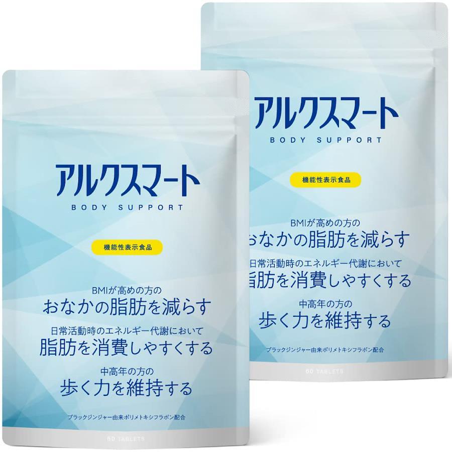 商品名:【セット】アルクスマート お腹の脂肪 内臓脂肪 皮下脂肪を減らす サプリメント 機能性表示 30日分 2個セット おなかの脂肪(内臓脂肪・皮下脂肪)を減らす機能が報告されているブラックジンジャー由来ポリメトキシフラボンを配合。肥満気味の方やBMIが高めの方、歩く力を維持したい方にオススメです。1日2粒でOKです。 こんなお悩み感じていませんか? ●家族にお腹を指摘された ●年を重ねて、お腹に脂肪がついてきた ●1年前の服が着れなかった ●洋服をサイズアップしたくない ●運動しても効果が出ない ●脂肪の数値が気になる ●ダイエットが長続きしない アルクスマート は12週間の摂取でお腹の脂肪の減少と歩行能力が向上する結果が出ています。 腹部の脂肪(内臓脂肪及び皮下脂肪)を減らしてスマートな体系を維持していただくために、長く続けていただくことをおすすめします。 厳格な検査・試験をクリアしたブラックジンジャー抽出物を12mg配合。さらにスマートを目指すサポート成分として、食物繊維・乳酸菌・ビフィズス菌・コンドロイチン硫酸・Ⅱ型コラーゲンを配合。