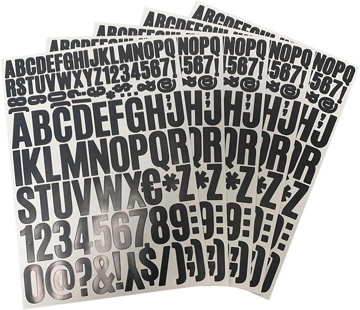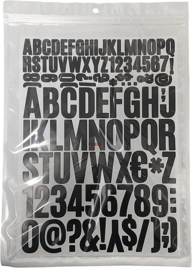 ツヤのある黒色のアルファベットと数字シールの5シートセットです。