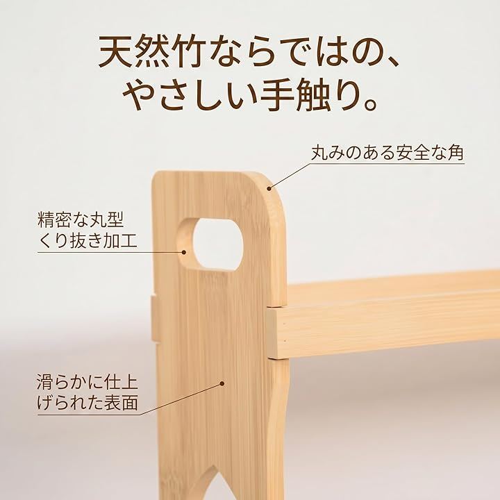 「天然竹x職人品質で安心」 環境に優しい天然竹を丁寧に加工し、滑らかな表面と安全な丸み処理で手触りも優しい仕上がり。