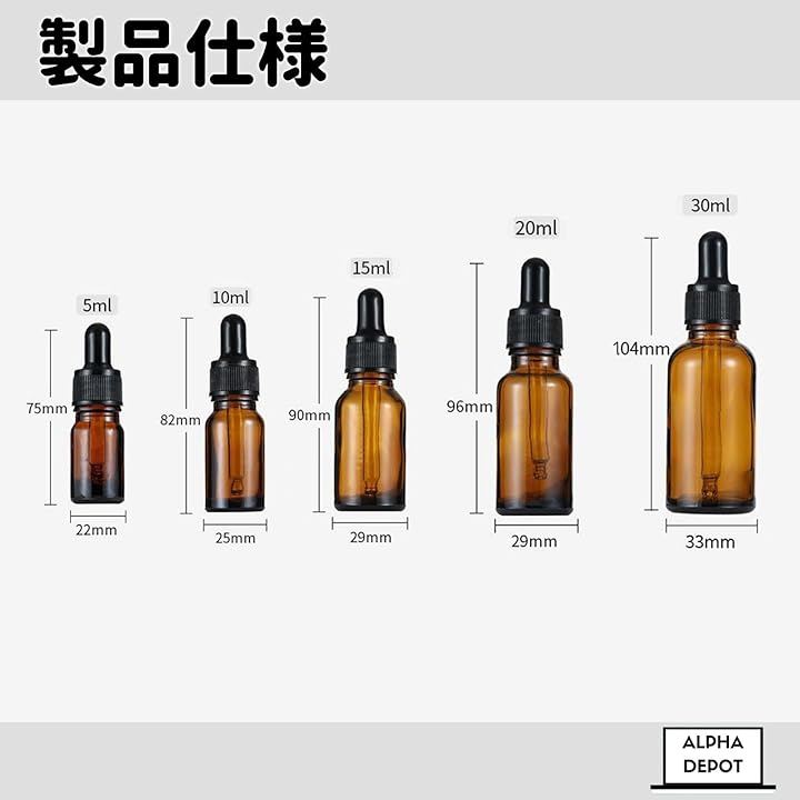 「サイズ」5ml:75 x 22mm / 10ml:82 x 25mm / 15ml:90 x 29mm / 20ml:96 x 29mm / 30ml:104 x 33mm