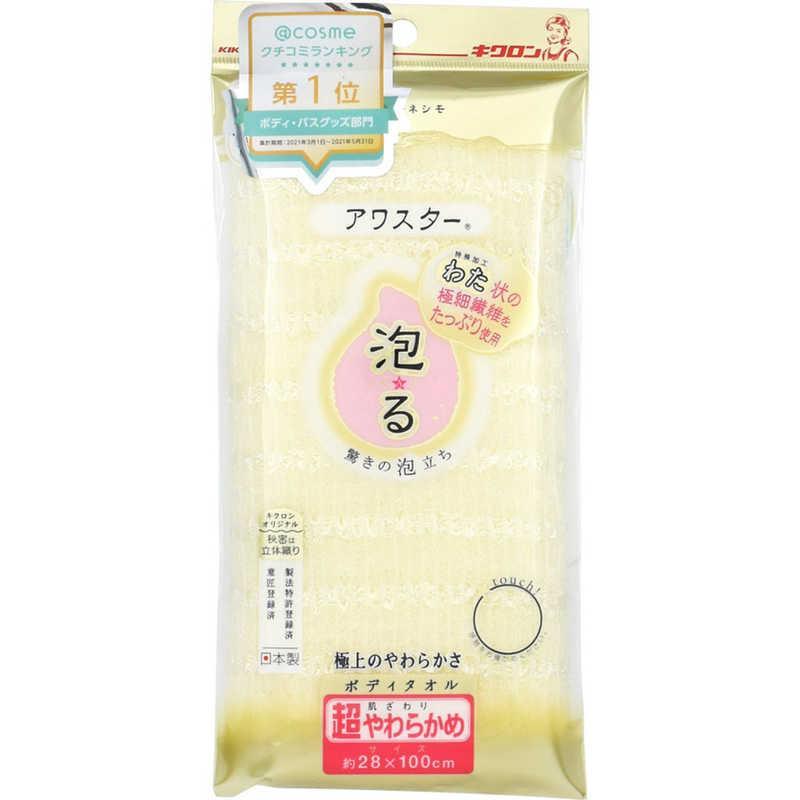 驚きの泡立ち♪ボディソープ・せっけん、どちらもたっぷり泡立つ!圧倒的な泡立ち!!今までにないウェーブ立体織りのナイロンボディタオル。驚きのたっぷりとした泡立ち、すすぎも簡単で乾きも早いです。●3次元ウェーブ立体織りキクロンの独自製法による立体織りで縦糸・横糸に作り出された3次元空間に、空気をたくさん溜めることで、圧倒的な泡立ちを実現しました。●超極細繊維66ナイロンアワスターの繊維には細さと強度が特長の、超極細繊維66ナイロンをたっぷり使用。独自の織りによるクリンプ加工が、コシとやわらかさを更にアップ、細くしなやかな繊維がお肌になじみ、きめ細かい泡立ちを生み出します。