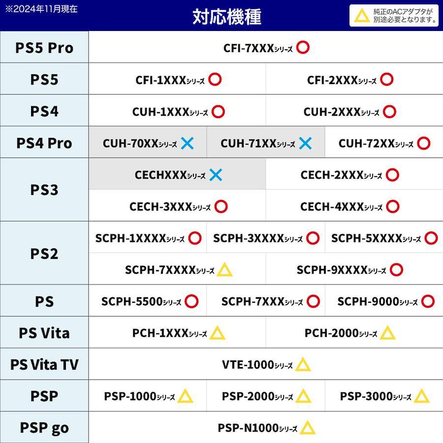 初期型PS3(CECHA00/B00/H00/L00シリーズ)には対応しておりません。※2 PS2(SCPH-70000番台シリーズ)・PSVita・VitaTV・PSP・PSPgoの各本体には、純正のACアダプタが別途必要となります。