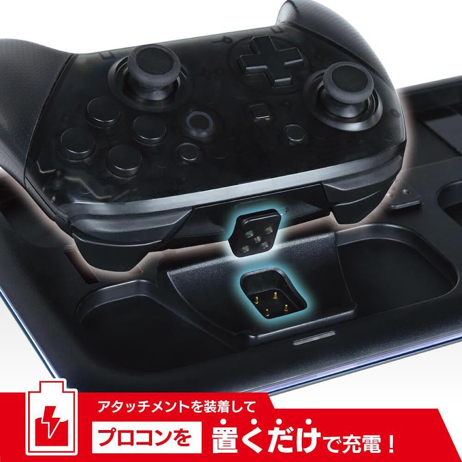 ジョイコンを4本同時充電可能。さらに、プロコンにアタッチメントをつけることでプロコンを置くだけで充電可能です。