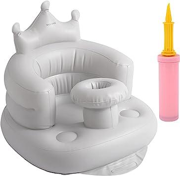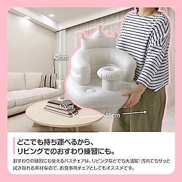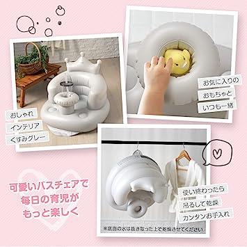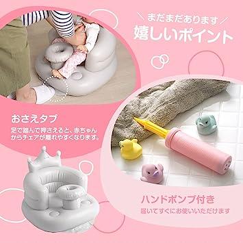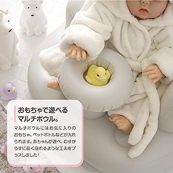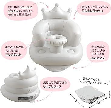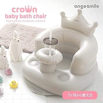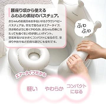 7ヶ月以降の腰すわり頃から使える使えるふわふわ素材のベビーバスです。空気で膨らませるエアータイプで、浮き輪のように軽くやわらか。赤ちゃんの体にあたっても痛くありません。他にないクラウンデザインで、赤ちゃんも小さな王様気分!赤ちゃんのバスチェアや、お部屋でのベビーチェアとしてもお使いいただけます。底面に水またはお湯を入れることで、安定感が増し座り心地も快適になります。夏なら冷水を入れてひんやり、冬は50℃未満のお湯を入れて温座にも。赤ちゃんのズレ防止ストッパーはマルチボウルにもなっており、お気に入りのおもちゃやペットボトルなどが入れられます。赤ちゃんが遊べ、むずがらず長く座れる工夫をプラスし