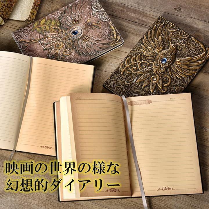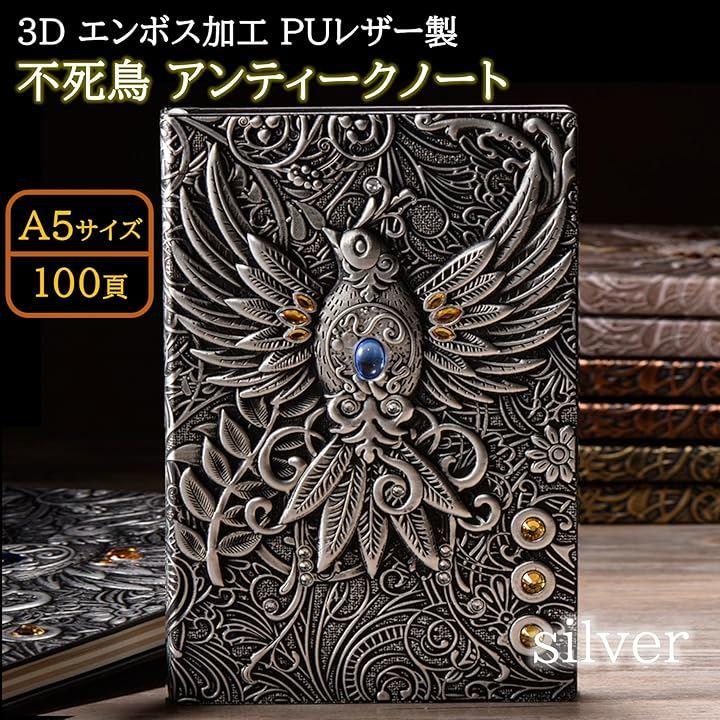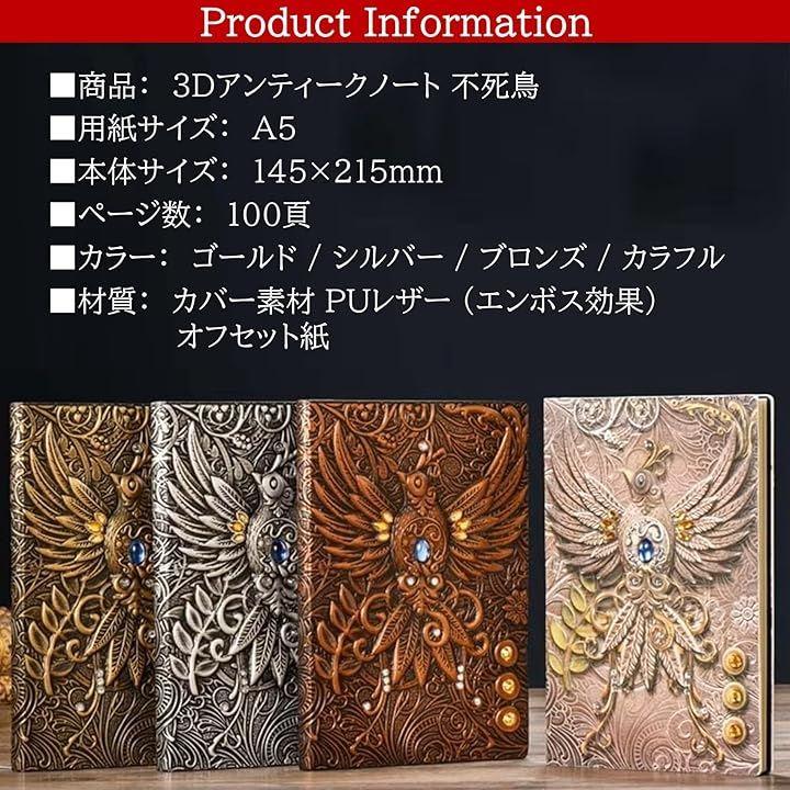 商品詳細:3D不死鳥アンティークノート 「用紙サイズ」 A5 「本体サイス」 145x215mm 「ページ数」 100頁「カラー」 ゴールド/シルバー/ブロンズ/カラフル 4種 「材質」 カバー素材 PUレザー/オフセット紙 「重量」 約390g