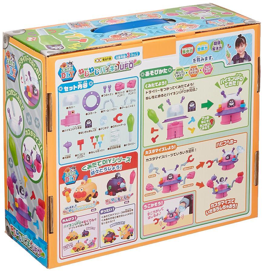 3営業日以内に発送≪新品未開封品≫ねじとドライバーを使って楽しくカンタンにくみたて遊びができる、アンパンマンくみたてDIYシリーズ!安心安全なお子様サイズのねじと手動トライバーを使って、バラバラなパーツを組み立てて、バイキンUFOを作っちゃおう。マジックバンド、ロボットアーム、レーダー、光線銃、ハンマーを使って、カスタマイズもできちゃう。いろんなパーツを持たせてみよう!完成したバイキンUFOは手ころがしで走るよ。ねじねじアンパンマンごう(別売)に連結すると、アンパンマンごうと一緒に走らせることもできる![セット内容]バイキンUFO本体(5パーツ)・カスタマイズ部品8パーツ(アーム4個・マジックハンド2個・レーダー・ロボットアーム・光線銃・ハンマー)・ばいきんまん人形・手動ドライバー・ネジ10個・取扱説明書