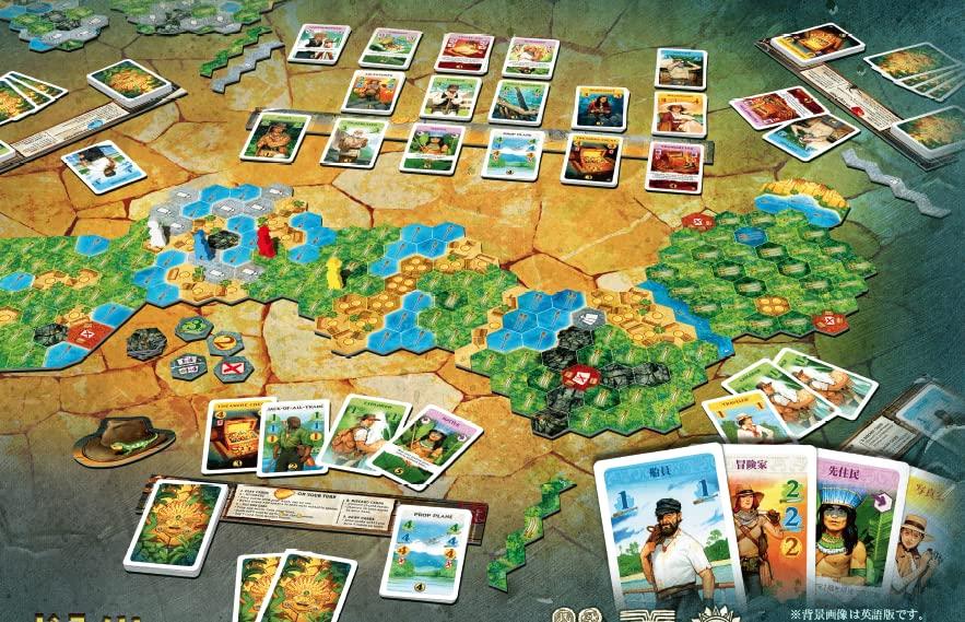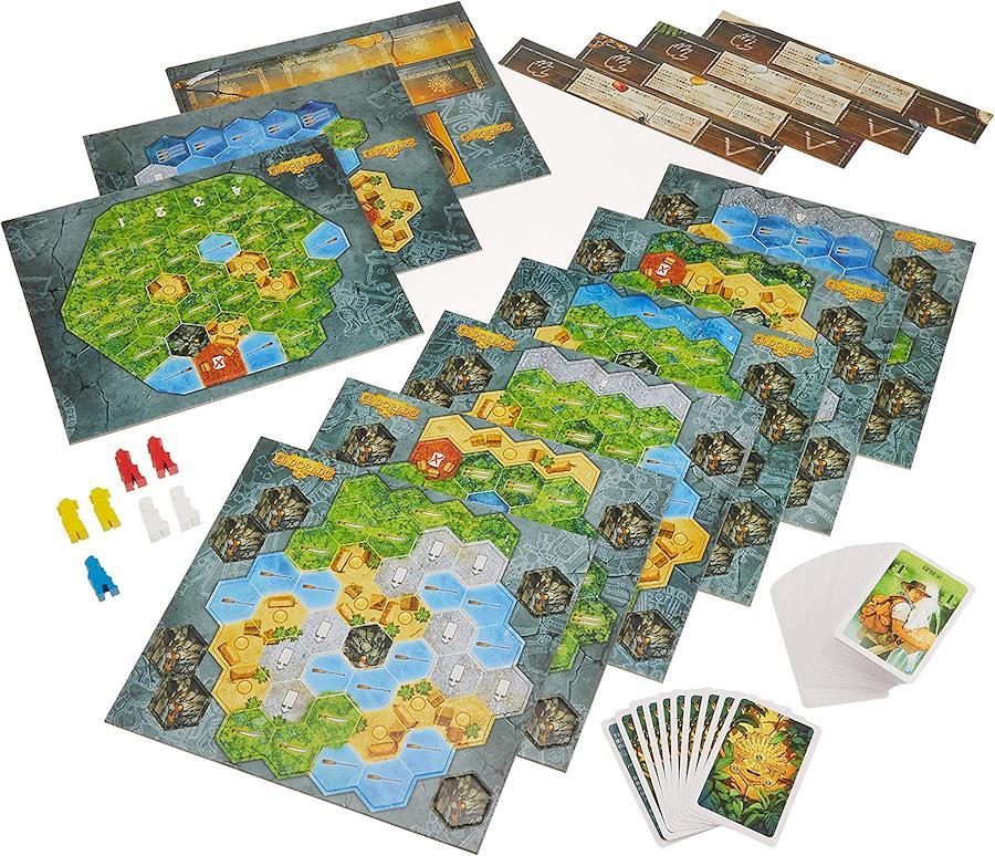 [セット内容]出発地点タイル1枚地形タイル6枚小地形タイル2枚ゴールタイル1枚障害タイル6枚市場ボード1セットプレイヤーボード4枚探検家コマ8個(4色×2個)親マーカー1枚洞窟トークン36個開始時探検カード4セット市場カード54枚(プロモカード3種入り)ルール説明書1冊[※カードサイズ:56×87mm]