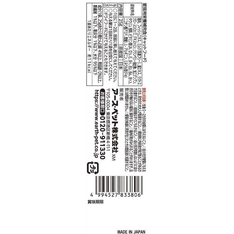 本体サイズ(幅X奥行X高さ):4.6×1×14.5cm本体重量:25g原産国:日本栄養成分:栄養成分:粗たんぱく質4%以上、粗脂肪0%以上、粗繊維1%以下、粗灰分1%以下、水分95%以下、代謝エネルギー11kcal/1袋濃厚な美味しい味わいの、やさしい流動食下部尿路の健康維持に配慮しクランベリー抽出物配合健康に配慮し猫の必須アミノ酸であるタウリン、アルギニンを配合