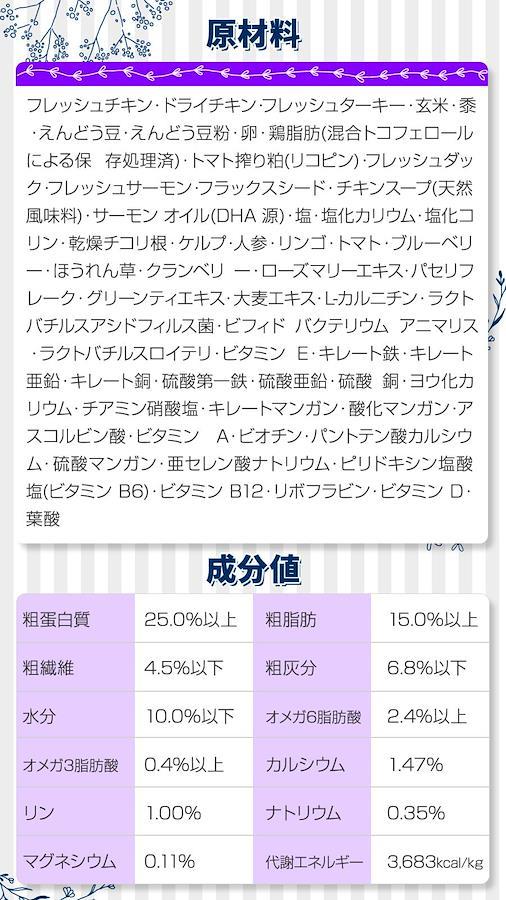 フレッシュチキン・ドライチキン・フレッシュターキー・ドライ魚肉・大麦・玄米・米・鶏脂肪(混合トコフェロールによる保存処理済)・オーツ麦・黍・ポテト・乾燥卵・トマト絞り粕・フレッシュダック・フレッシュサーモン・フラックスシード・チキンスープ(天然風味料)・サーモンオイル・塩化コリン・乾燥チコリ根・脱脂粉乳・ケルプ・人参・リンゴ・トマト・ブルーベリー・ほうれんそう・クランベリー・ローズマリーエキス・パセリフレーク・えんどう豆粉・グリーンティエキス・大麦エキス・L-カルニチン・エンテロコッカスフェシウム・ラクトバチルスカゼイ・ラクトバチルスアシドフィルス・サッカロミセス発酵溶解物・乾燥麹菌発酵エキス・ビタミンE・鉄タンパク質・亜鉛タンパク質・銅タンパク質・硫酸第一鉄・硫酸亜鉛・硫酸銅・ヨウ化カリウム・チアミン硝酸塩・マンガンタンパク質・酸化マンガン・アスコルビン酸・ビタミンA・ビオチン・パントテン酸カルシウム・硫酸マンガン・亜セレン酸塩ナトリウム・ピリドキシン塩酸塩(ビタミンB6)・ビタミンB12・リボフラビン・ビタミンD・葉酸
