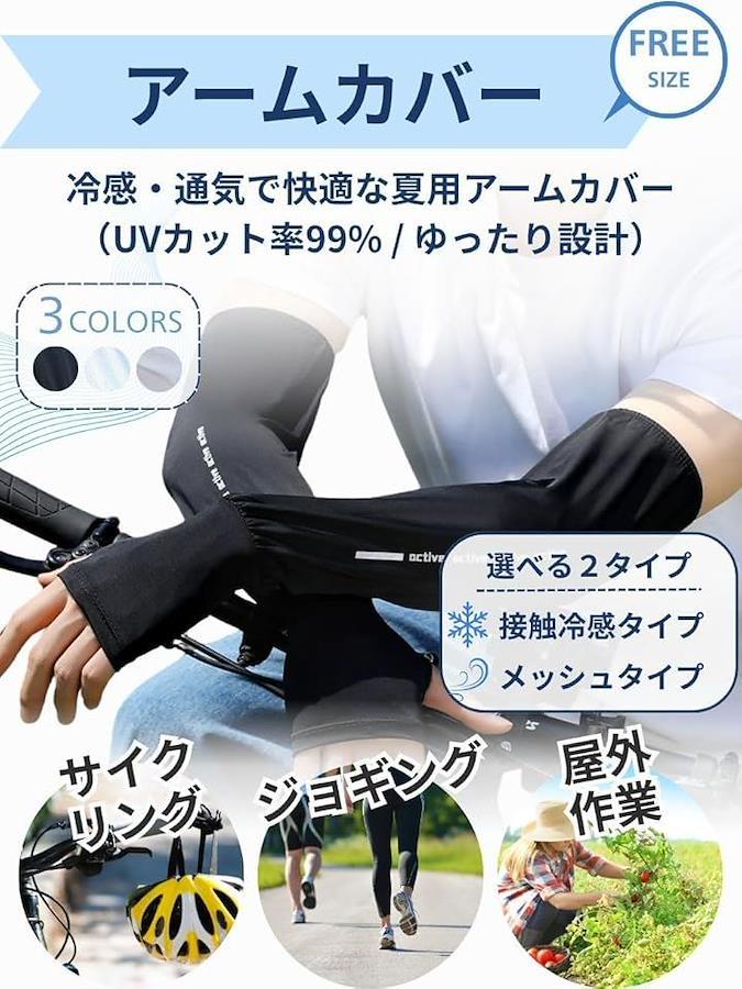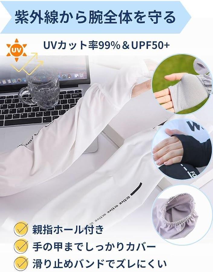 紫外線をカットする生地(UVカット率99%以上、UPF50+)を使用し、日差しの強い時期の腕の保護に役立ちます。