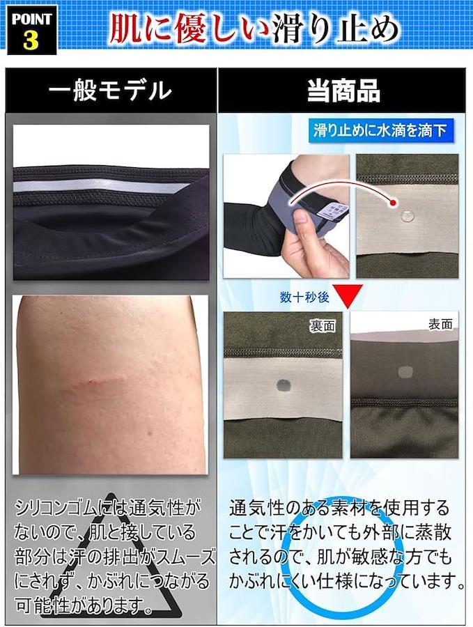 ずれ落ちを防止する滑り止めには、吸水性のあるしっとりソフトな素材を採用することで汗を外部に蒸散させることができ、汗かぶれを引き起こしにくくしています。