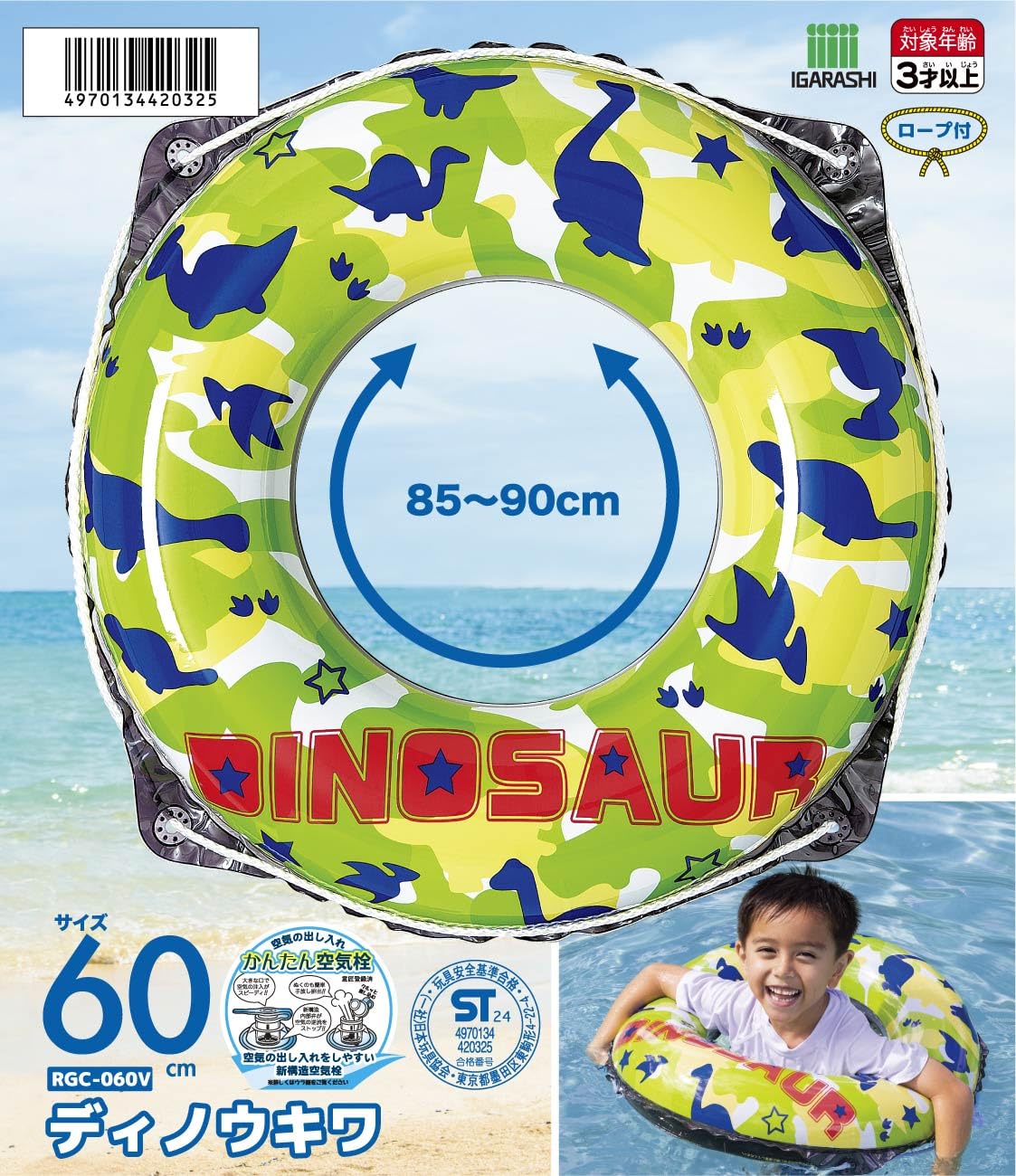 対象年齢4歳~8歳くらいのお子様に最適!。膨らんだ状態のウキワの内周は約85~90cmです。ロープ付き。
