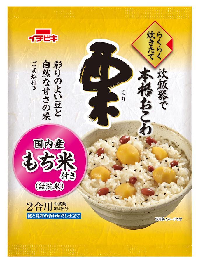 イチビキ株式会社は、1772年(安永元年)に幕府の株をもとに、みそ・たまりしょうゆの醸造を始めました。1919年(大正8年)に前身となる大津屋株式会社を設立、おかげさまで多くのお客様に支えられ、2019年には株式会社設立100周年を迎えることができました。これからもお客様の立場に立ち、創業より培った醸造技術を最大限生かし、お客様に選んでいただける品質を追求し続けます。また、お客様のニーズの変化にあわせて、新たな技術を磨き、様々な調味料・加工食品の開発に取り組んでまいります。自然な甘さの栗と赤いんげん豆を加え、彩りよく仕上げました。 鰹と昆布の合わせだし仕立てです。 国内産もち米(無洗米)付きなので、ご家庭で簡単に本格おこわが楽しめます。【内容量】本格おこわ栗 373g×2個【原材料】無洗米[もち米(国産)]、栗おこわの具[栗、赤いんげん豆、砂糖、還元水あめ、米発酵調味料、しょうゆ、食塩、鰹節エキス、昆布エキス/酸化防止剤(ビタミンC)、乳酸Ca、クチナシ色素、(一部に小麦・大豆を含む)]、ごま塩[ごま、食塩、もち米加工品、(一部にごまを含む)]【アレルギー】小麦・ごま・大豆【重要】メーカーによる商品リニューアルに伴いパッケージ(内容量も含む)変更が行われた場合、新パッケージでお届け致します事ご了承願います。