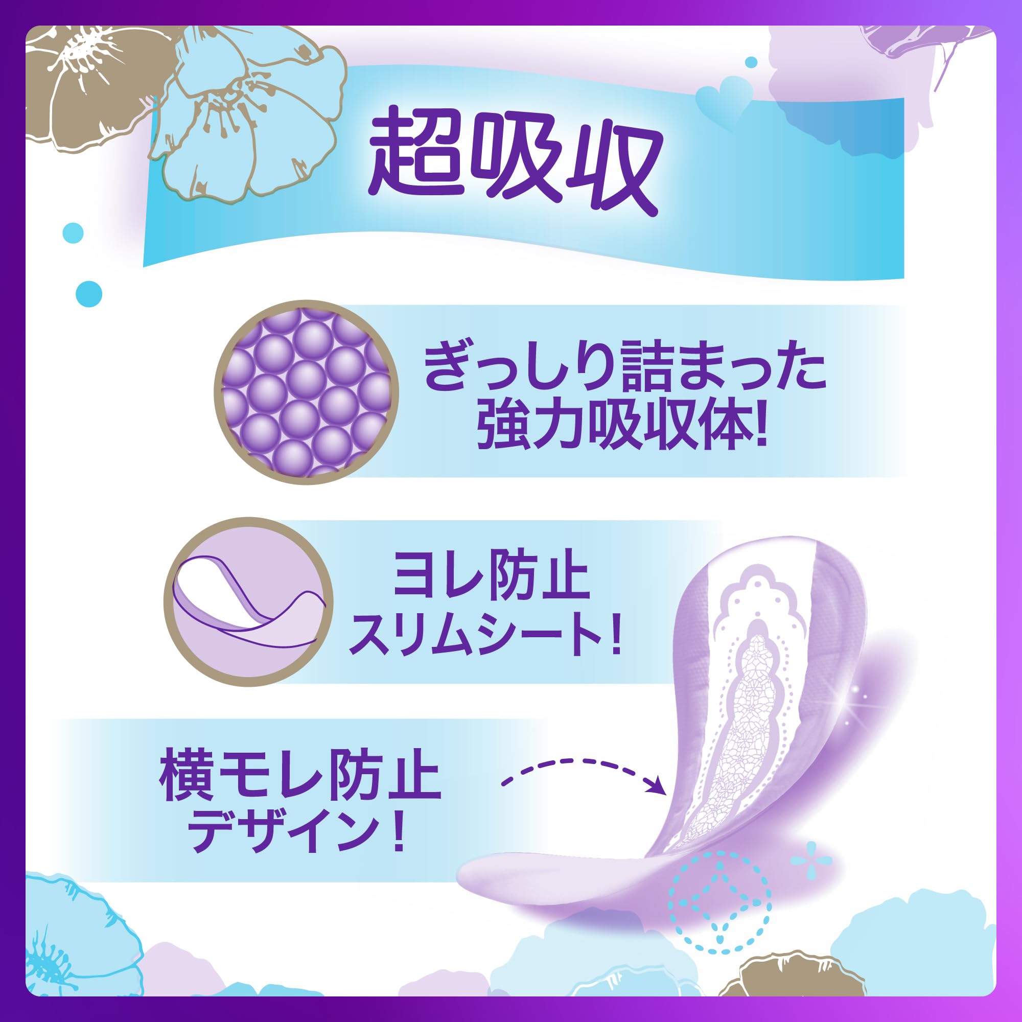 「超吸収&超消臭」の尿漏れパッド(吸水ケア・吸水パッド・尿もれパッド)【無香料】ぎっしり詰まった「強力吸収体」だから、薄いのにしっかり吸収。においも吸収*。 (*水分を吸収することによる)「ヨレ防止スリムシート」 うすいのに動いてもヨレにくい。「横もれ防止デザイン」が、 横もれからしっかりガード。