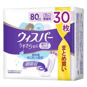 ■商品概要メーカー:P&G商品名:ウィスパー うすさら安心 女性用 吸水ケア 80cc 無香料 【中量用】(30枚入)区分:日用雑貨内容量:30枚商品概要:超快適&においも吸収JANコード:4987176265821商品コード:076120921