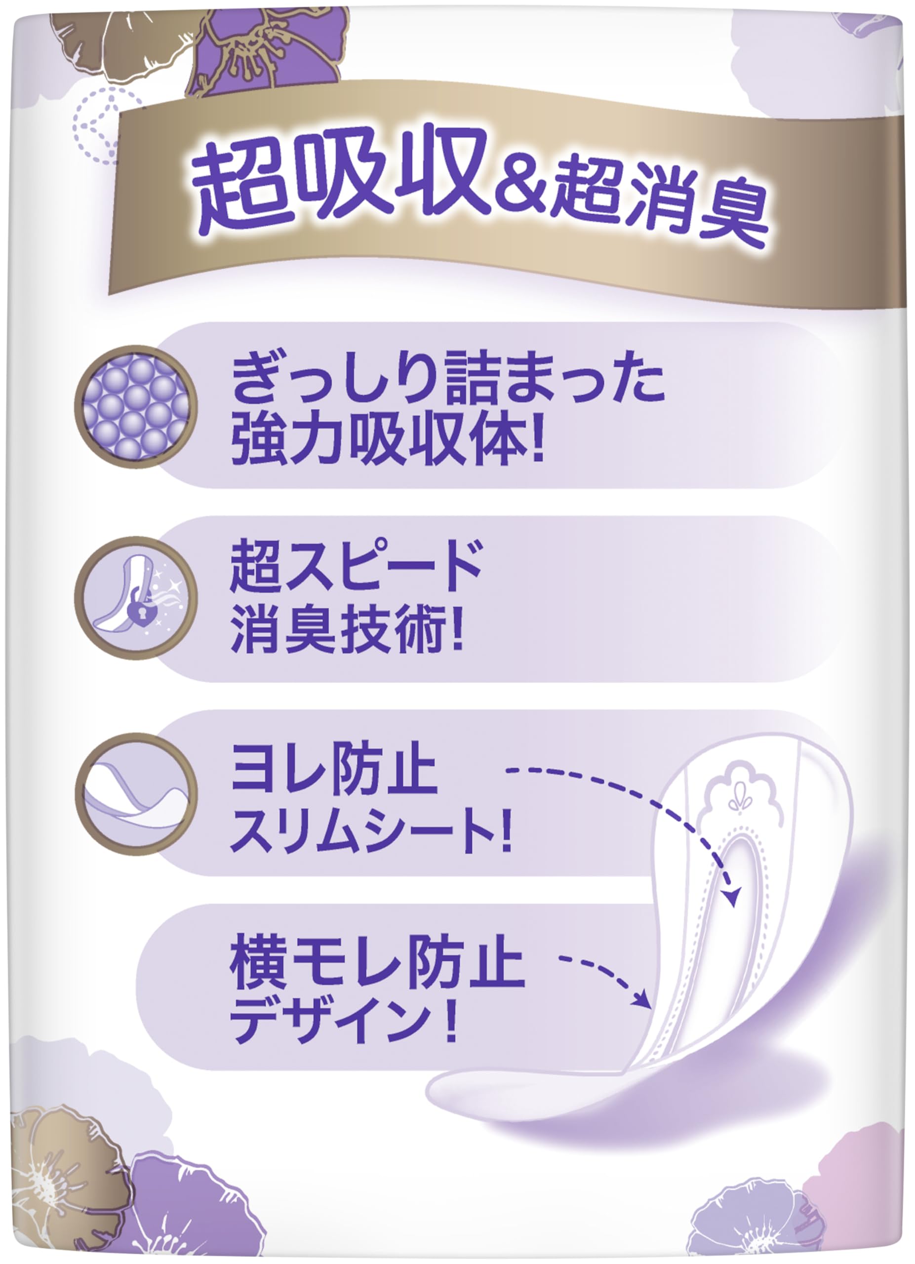 (尿もれ、にょう漏れ、尿モレ、尿取り) 超吸収、超快適、超消臭。 ぎっしり詰まった「強力吸収体」だから、しっかり吸収。 超スピード消臭技術。 いやなにおいを中和する技術で、吸水後のにおいもすぐに消臭。 「ヨレ防止スリムシート」だから、動いてもよれにくい。 ウィスパーは女性用の吸水ナプキン(尿漏れパッド、尿とりパッド)です。(尿もれ、にょう漏れ、尿モレ、尿取り)