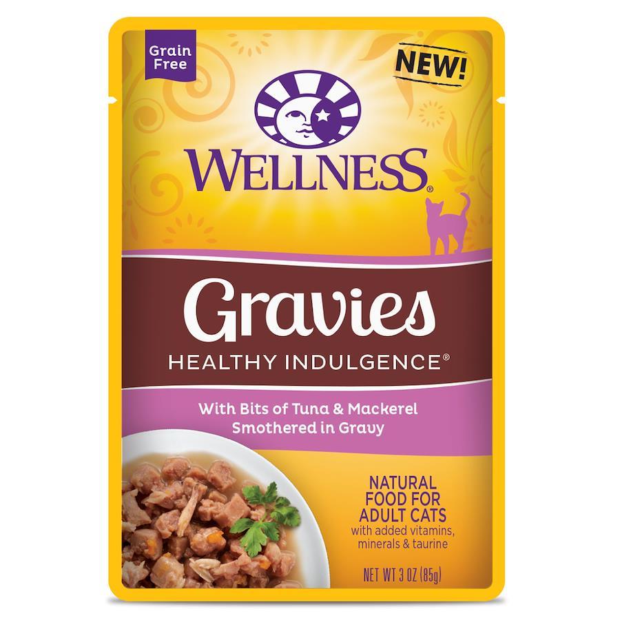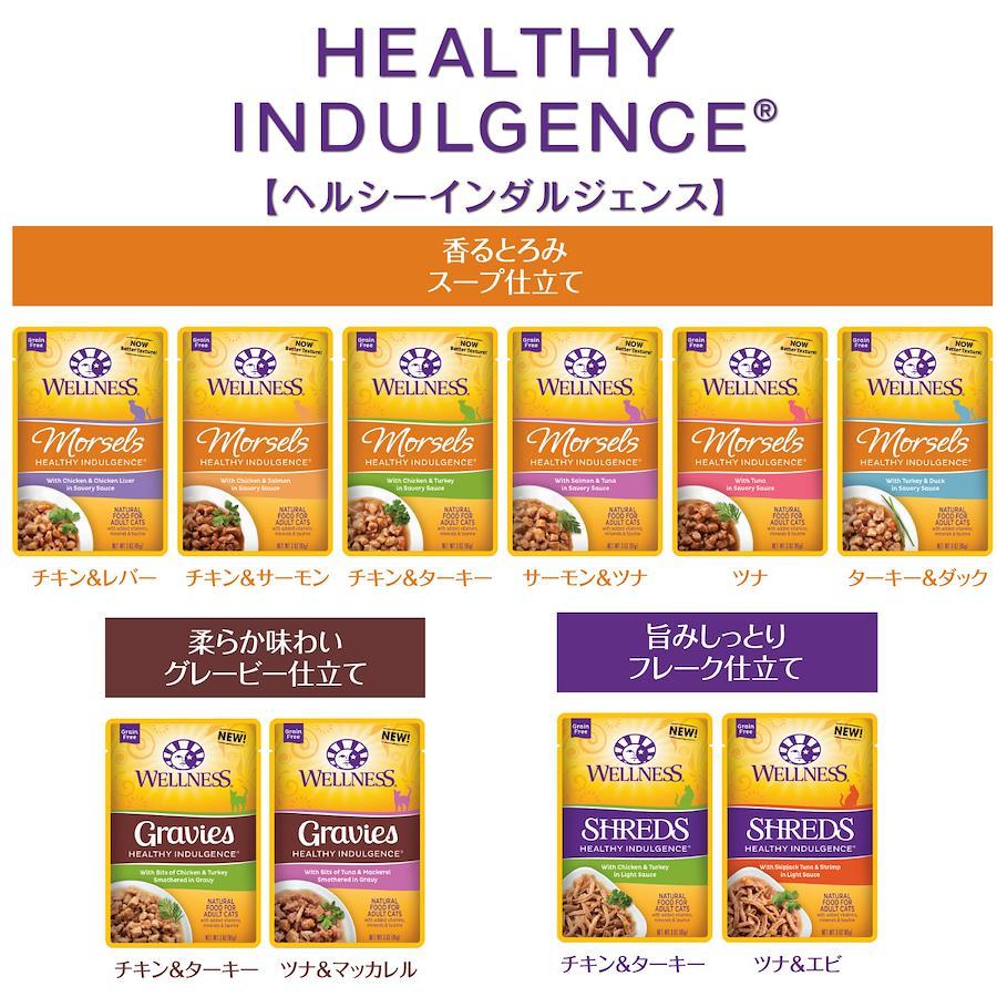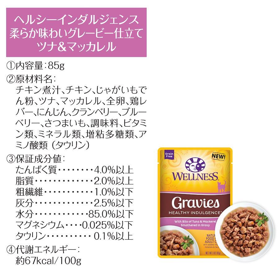 ウェルペット社は、2008年に、90年近い歴史を持つオールドマザーハバード社と、40年以上の歴史を持つイーグルパック社の2つの優良ペットフードカンパニーの統合により誕生しました。ウェルペット社は健康に配慮した安全で安心なペットフードを作ることを使命と考えています。「ウェルネス ヘルシーインダルジェンス 柔らか味わいグレービー仕立て ツナ&マッカレル」は、厳選自然素材を使用した穀物不使用の総合栄養食ウェットフードです。グルメを極めたネコちゃんに、魅惑のソースと厳選素材のおいしさを。クランベリー、ブルーベリー、にんじん、サツマイモを配合。肉副産物・人工保存料・着色料・香料不使用。水分含有量が高いのでおいしく水分補給できます。魅惑のソースとお肉、お魚、野菜のマリアージュで毎日の食事を素敵に彩りませんか?