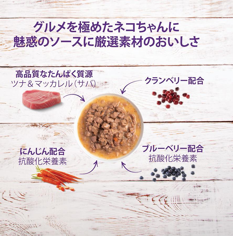チキン煮汁、チキン、じゃがいもでん粉、ツナ、マッカレル、全卵、鶏レバー、にんじん、クランベリー、ブルーベリー、さつまいも、調味料、ビタミン類、ミネラル類、増粘多糖類、アミノ酸類 (タウリン)