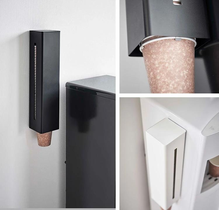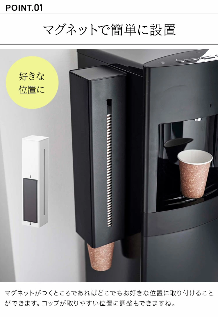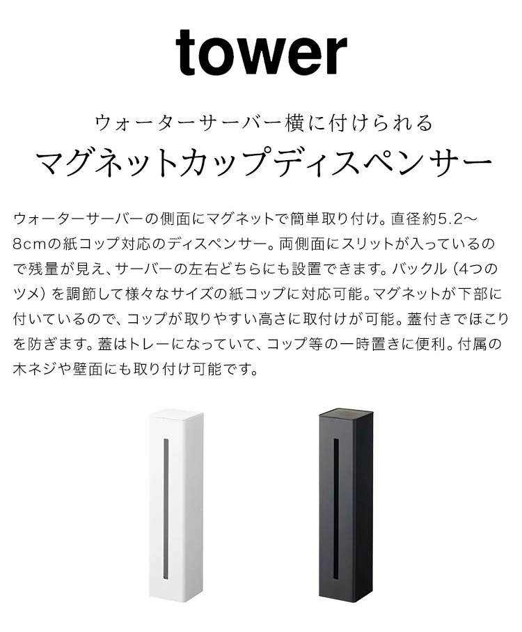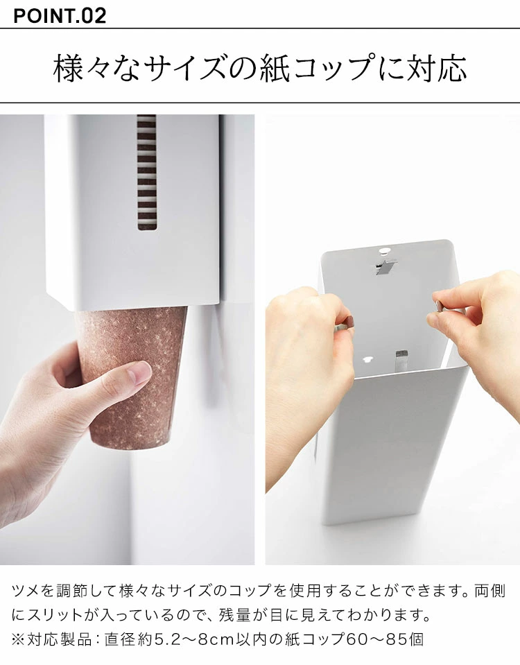 ウォーターサーバーの側面にマグネットで簡単取り付け。直径約5.2~8cmの紙コップ対応のディスペンサー。両側面にスリットが入っているので残量が見え、サーバーの左右どちらにも設置できます。バックル(4つのツメ)を調節して様々なサイズの紙コップに対応可能。マグネットが下部に付いているので、コップが取りやすい高さに取付けが可能。蓋付きでほこりを防ぎます。蓋はトレーになっていて、コップ等の一時置きに便利。付属の木ネジや壁面にも取り付け可能です。